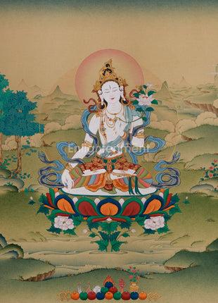 The thangka features the Seven-Eyes Goddess White Tara, intricately hand-painted on cotton canvas with natural stone pigments and embellished with genuine 24K gold. The earthy brilliance and soft depth of the mineral pigments add to her divine luminosity. White Tara is venerated in Himalayan Buddhism as a female Buddha associated with long life, healing, and compassion. Her lineage is deeply rooted in the meditative and healing practices of Tibet, where she is invoked as a protector who watches over all sentient beings with loving awareness.