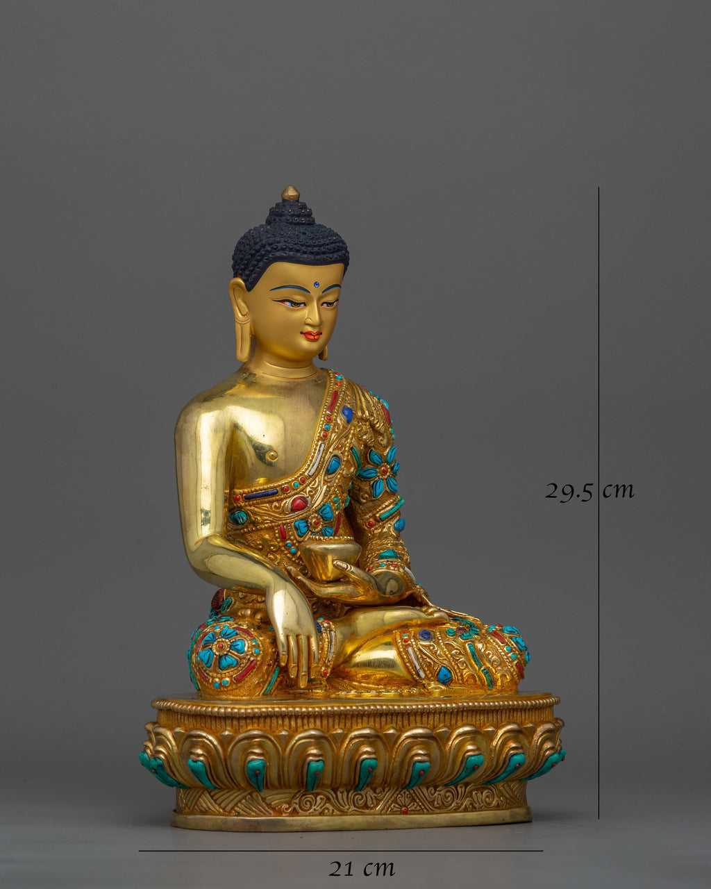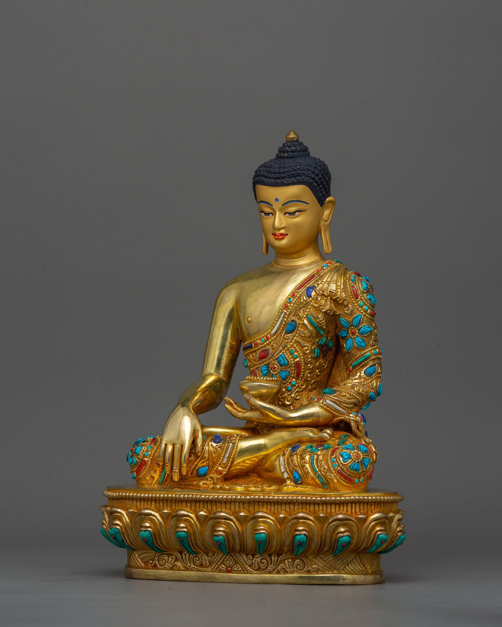 This 24k gold gilded sculpture features a stunning Shakyamuni Buddha adorned with gemstones like turquoise. Its details and craftsmanship make it a perfect addition to any spiritual or decorative collection. Embrace this iconic figure's peaceful energy and beauty in your home or office.