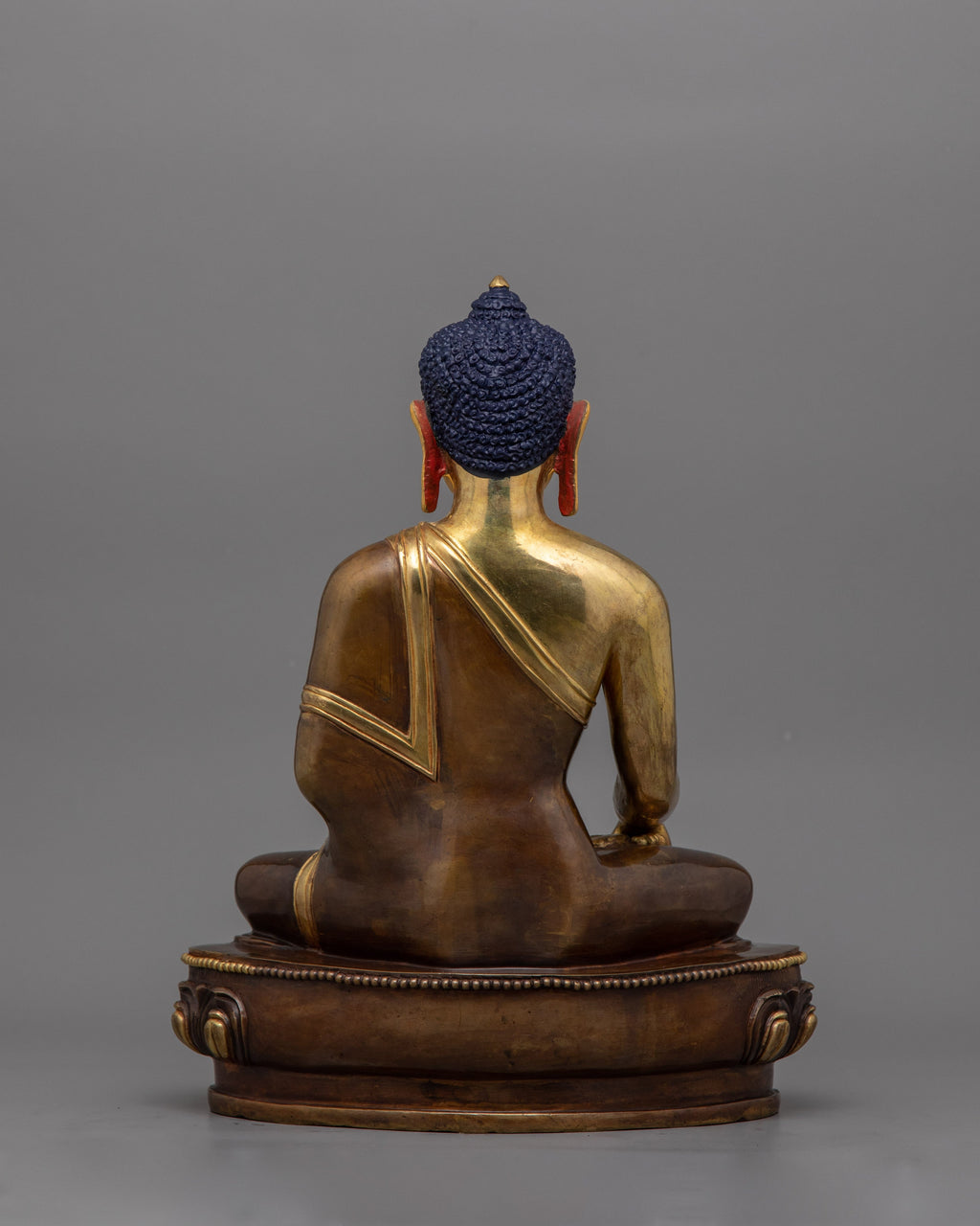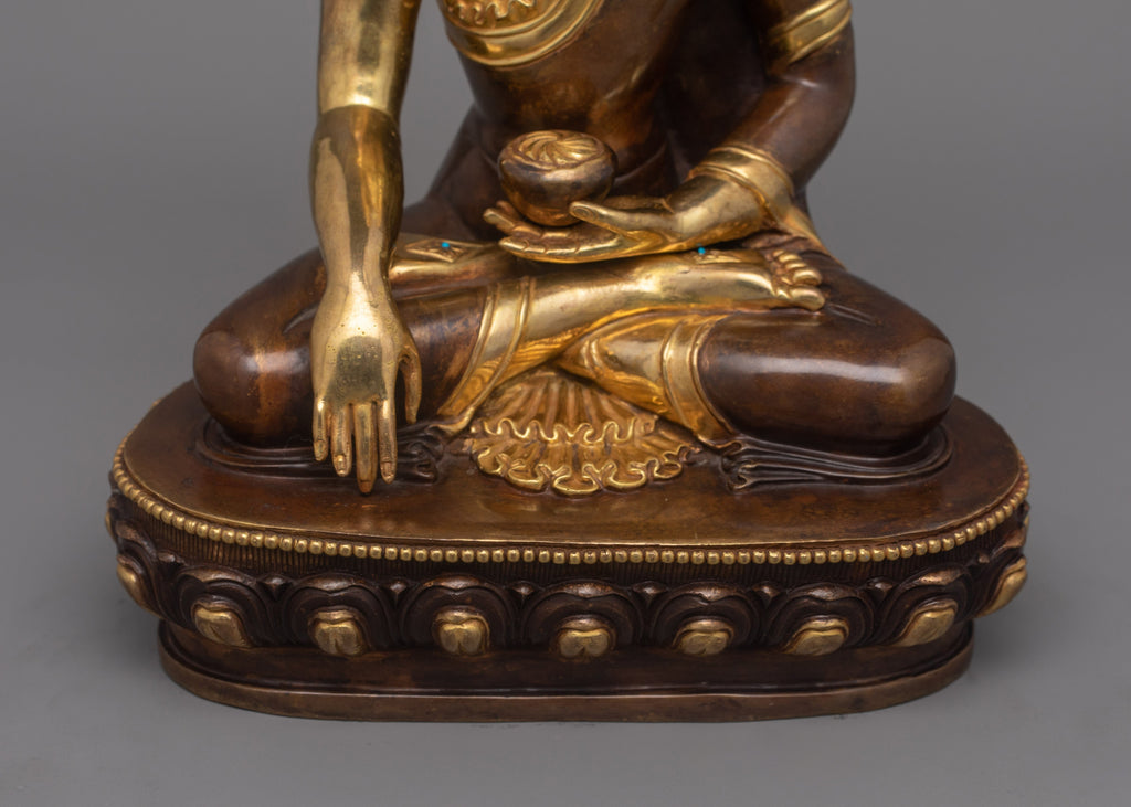 The Shakyamuni Buddha Buddhist Deity Statue symbolizes the Buddha's deep teachings and the path to spiritual awakening. This handcrafted statue is 11.2" (Height) x 8.3" (Base) and weighs 3.09 kg. It is made of oxidized copper, decorated with 24K gold gilding, and enhanced with gold and acrylic paints. This sacred statue, created by expert Nepalese artisans, represents the craftsmanship of Himalayan Buddhism, making it an inspirational addition to altars, meditation places, or sacred collections.