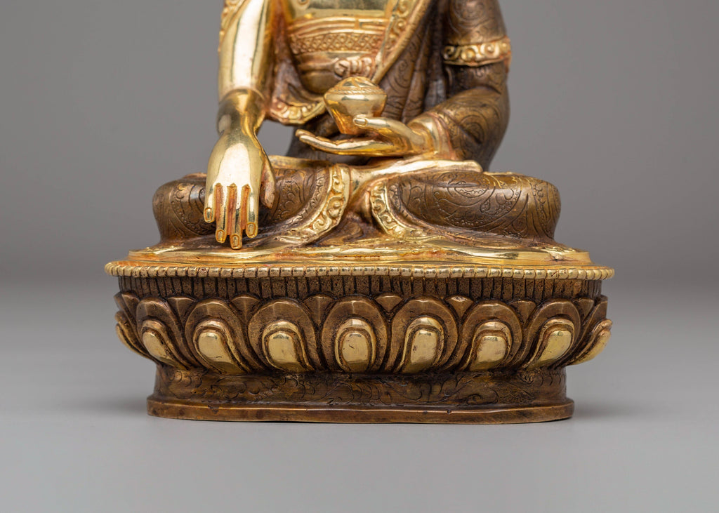 This handcrafted Shakyamuni Buddha statue presents the sacred image of the historical Buddha, honored in Buddhist tradition as the teacher of awakening and right understanding. Made with a copper body and finished in 24K gold plating, the statue follows classic Buddhist art seen in temples and monasteries. The calm face and seated meditation pose reflect peace, wisdom, and spiritual awareness.