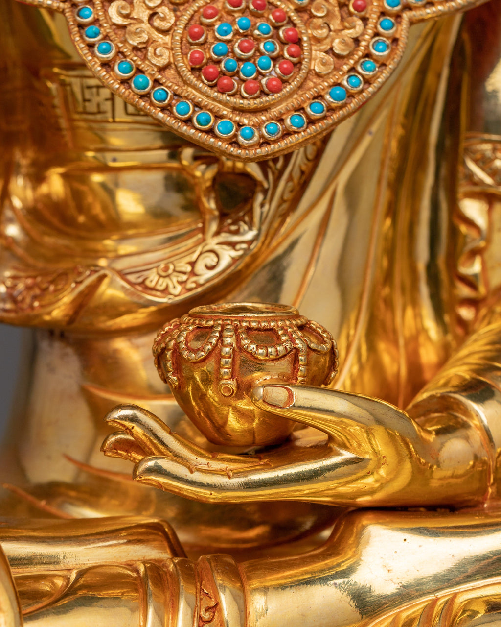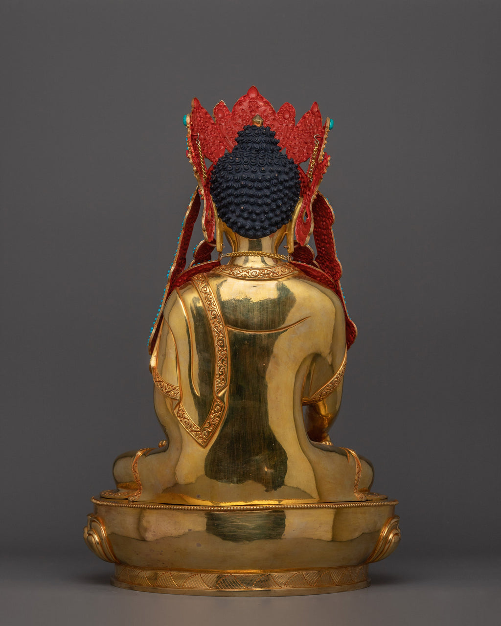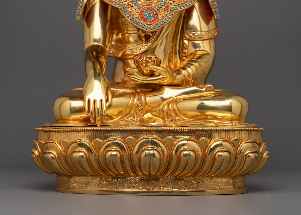 Adorn your space with this stunning Shakyamuni Buddha Crown Statue. Crafted with copper, covered with a triple layer of 24K gold gilding, and carved with deeply engraved carvings that produce a magnificent 3D-like effect. This sculpture, adorned with hand-carved gemstones crafted by expert Nepalese artisans, elegantly symbolizes the sacred traditions of Himalayan Buddhism and is an appropriate addition to altars, meditation spaces, or holy collections.