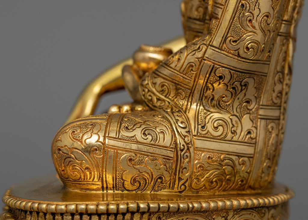 The Shakyamuni Buddha Dharma Teacher Sculpture, which represents knowledge, enlightenment, and the way to inner calm, is a timeless representation of the Buddha's teachings. This handcrafted statue is 8.7" (Height) x 5.7" (Base) and weighs 1.51 kg. It is built of solid copper, adorned with 24K gold gilding, and painted with gold and acrylic paints. This sacred sculpture, created by talented Nepalese artisans, represents the deep traditions of Himalayan Buddhism, making it an addition to altars, meditation rooms.