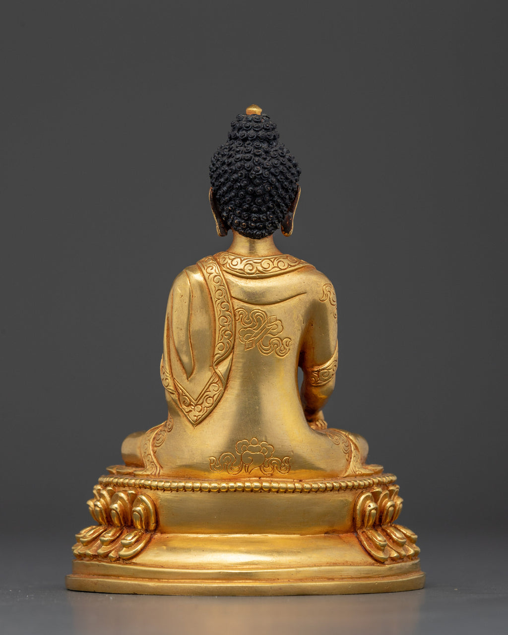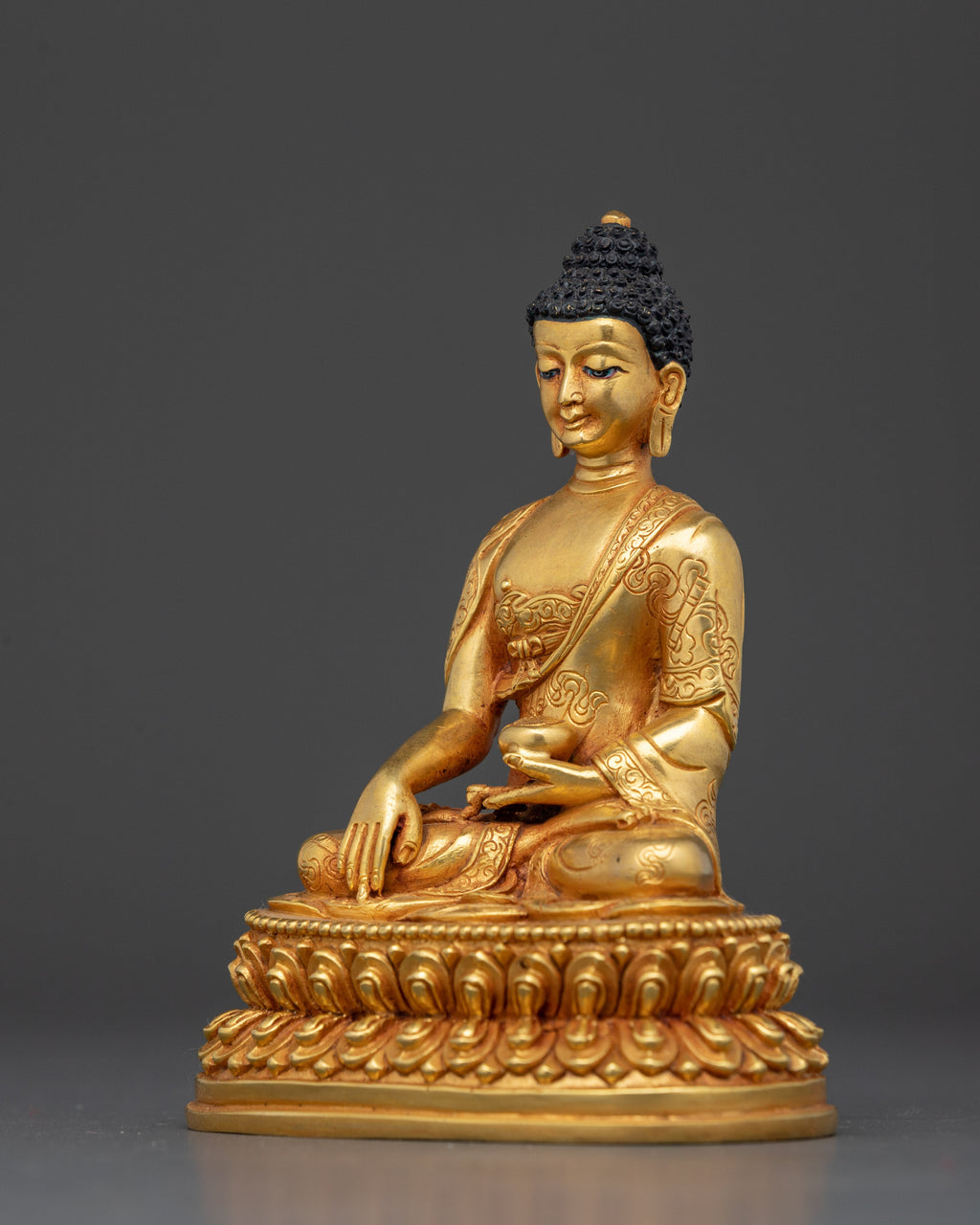 In this stunning sculpture, Shakyamuni Buddha is shown in the traditional earth-touching mudra, symbolizing his enlightenment under the Bodhi Tree. His tranquil look and meditative stance are complemented by delicate 24K gold gilding and beautiful acrylic paintings that depict the Buddha's triumph over ignorance and suffering. The statue's copper body provides durability and a long-lasting sheen, making it a valuable hand-carved gift or home décor item.