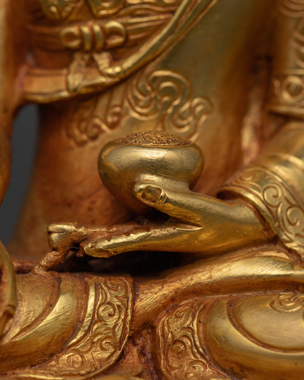 This meticulously constructed Shakyamuni Buddha Enlightened Being statue stands 5.1 inches (13.5 cm) tall, with a base of 3.7 inches (9.5 cm), and weighs 0.470 kg. The figure is composed of solid copper, gilded in 24K gold, and embellished with elaborate gold and acrylic paintings. This gorgeous depiction of Shakyamuni Buddha oozes calm and tranquillity, making it an ideal addition to any Buddhist altar, meditation area, or sacred home decor.
