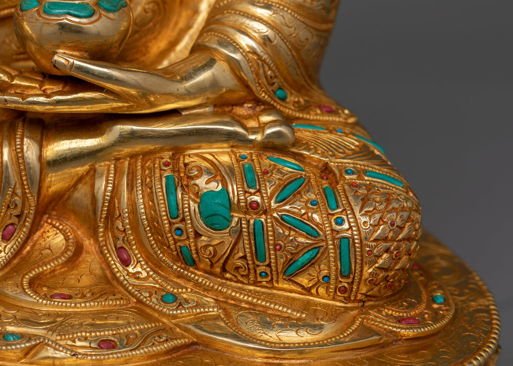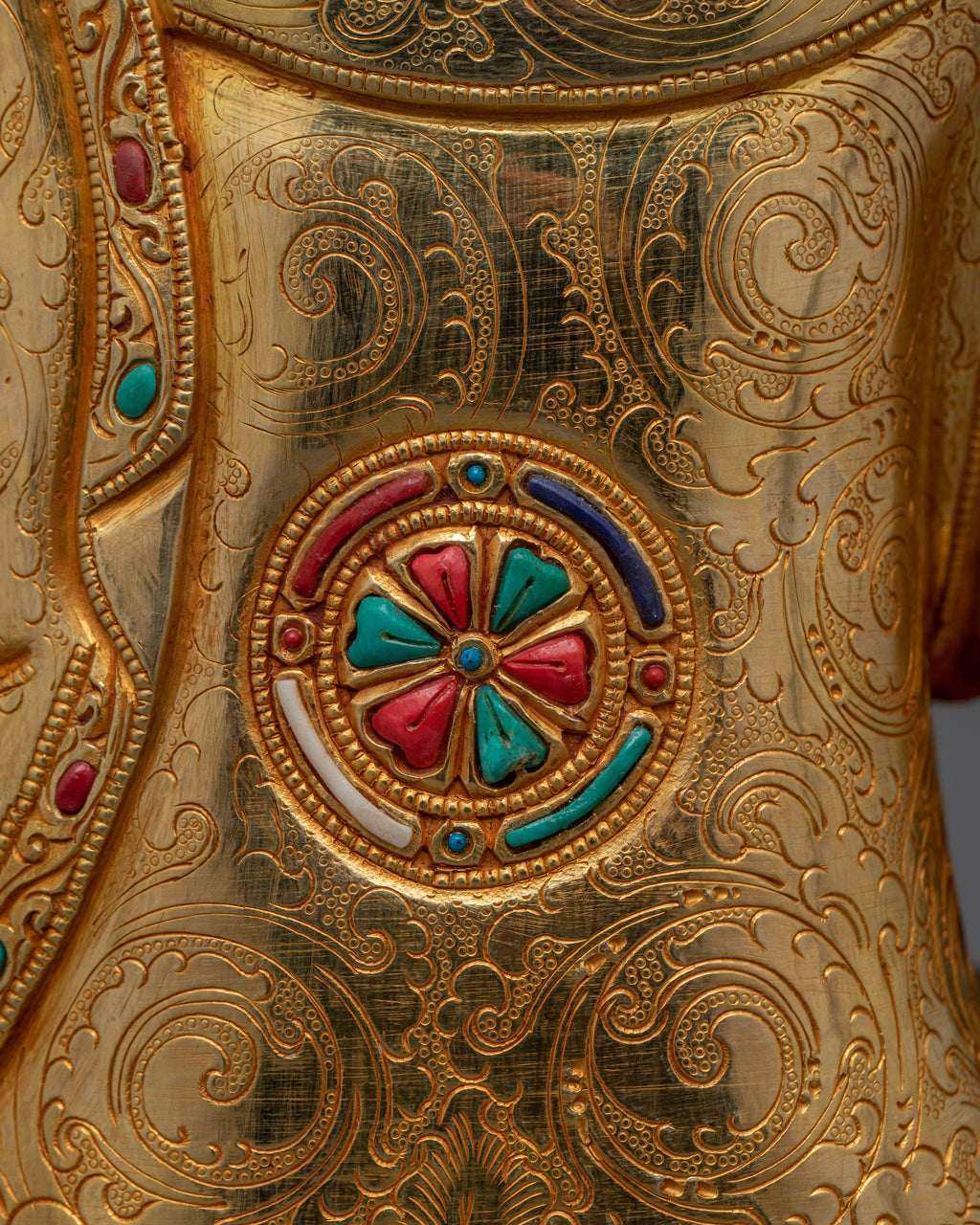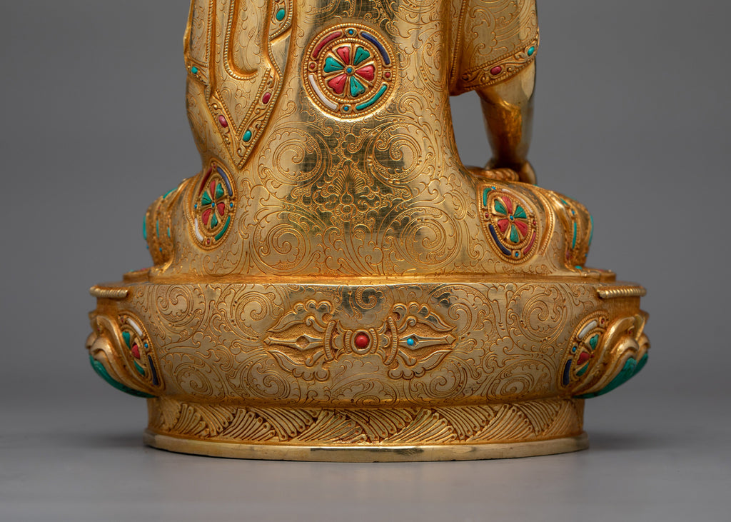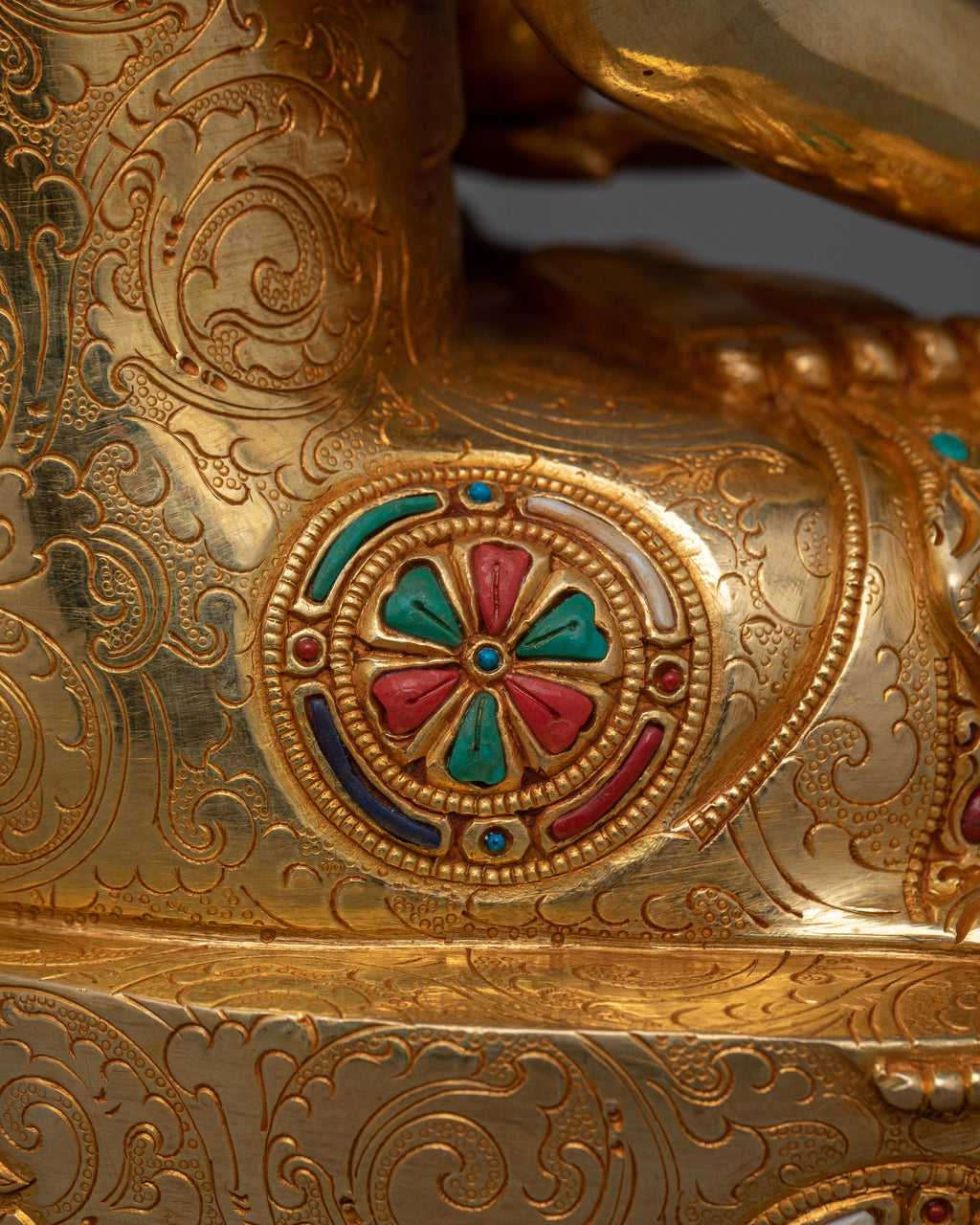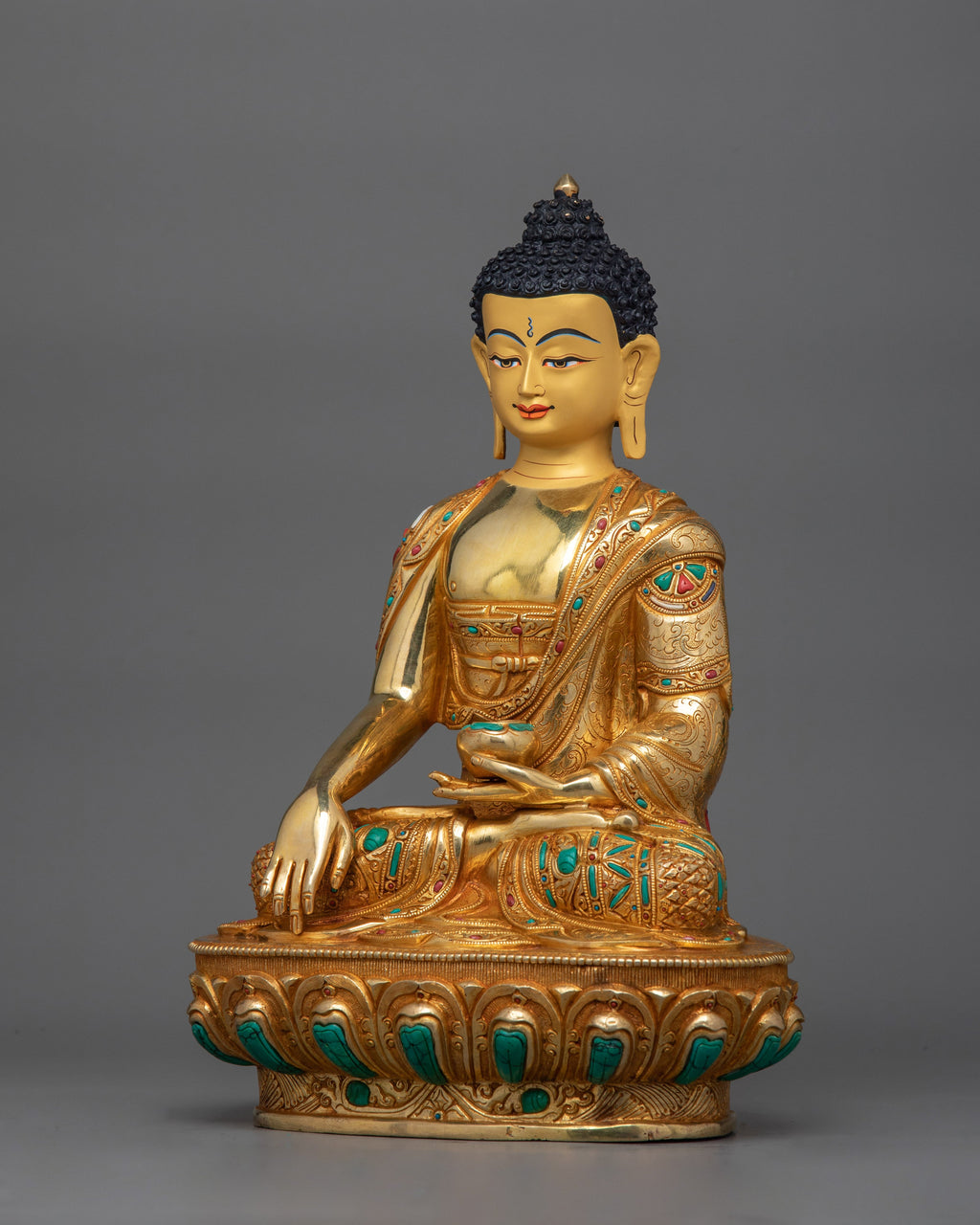 This Shakyamuni Buddha statue, also known as the Enlightened Dharma Teacher, represents profound wisdom, inner calm, and the road to enlightenment. This handcrafted statue, which measures 12.4" (Height) x 8.3" (Base) and weighs 3.14 kg, is made of solid copper, adorned with triple layer 24K gold gilding, enhanced with gold and acrylic paints, and decorated with hand-carved gemstones with deeply engraved 3D-like carvings. This sacred sculpture, handmade by talented Nepalese artisans, symbolizes the ageless traditions of Himalayan Buddhism, making it an excellent addition to altars, meditation rooms, or sacred collections.