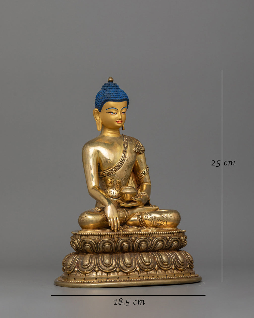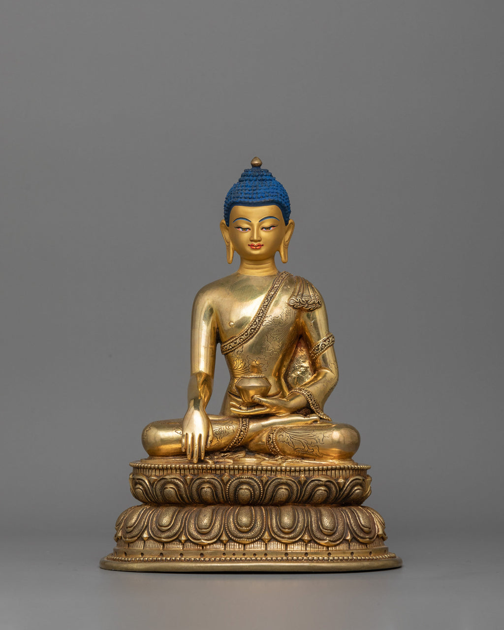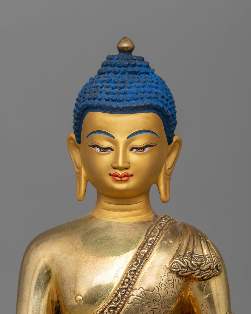 This Shakyamuni Buddha for Dharma Decor Figurine, a symbol of knowledge and enlightenment, represents the Buddha's deep teachings and the road to inner peace. This handcrafted statue measures 9.8" (Height) x 7.3" (Base) and weighs 2.10 kg. It is made of copper, adorned with 24K gold gilding, and enhanced with gold and acrylic paints. This sacred sculpture, created by talented Nepalese artisans, symbolizes the rich traditions of Himalayan Buddhism and is an addition to altars, meditation places, or sacred decor.