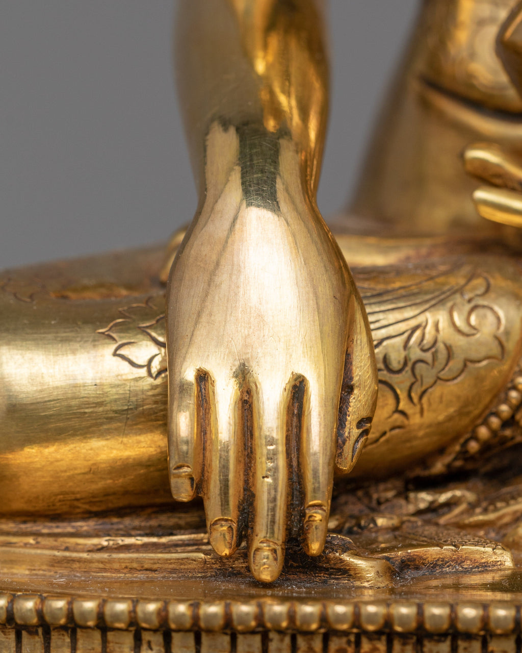 Shakyamuni Buddha is depicted sitting in the lotus pose (padmasana), indicating his steady concentration and mastery over the distractions of the material world. His right hand stretched toward the earth in bhumisparsha mudra, represents his moment of enlightenment, inviting the earth to witness his waking. The left hand, lying gently in his lap in dhyana mudra, depicts the profound state of meditation and mindfulness that leads to insight and clarity.