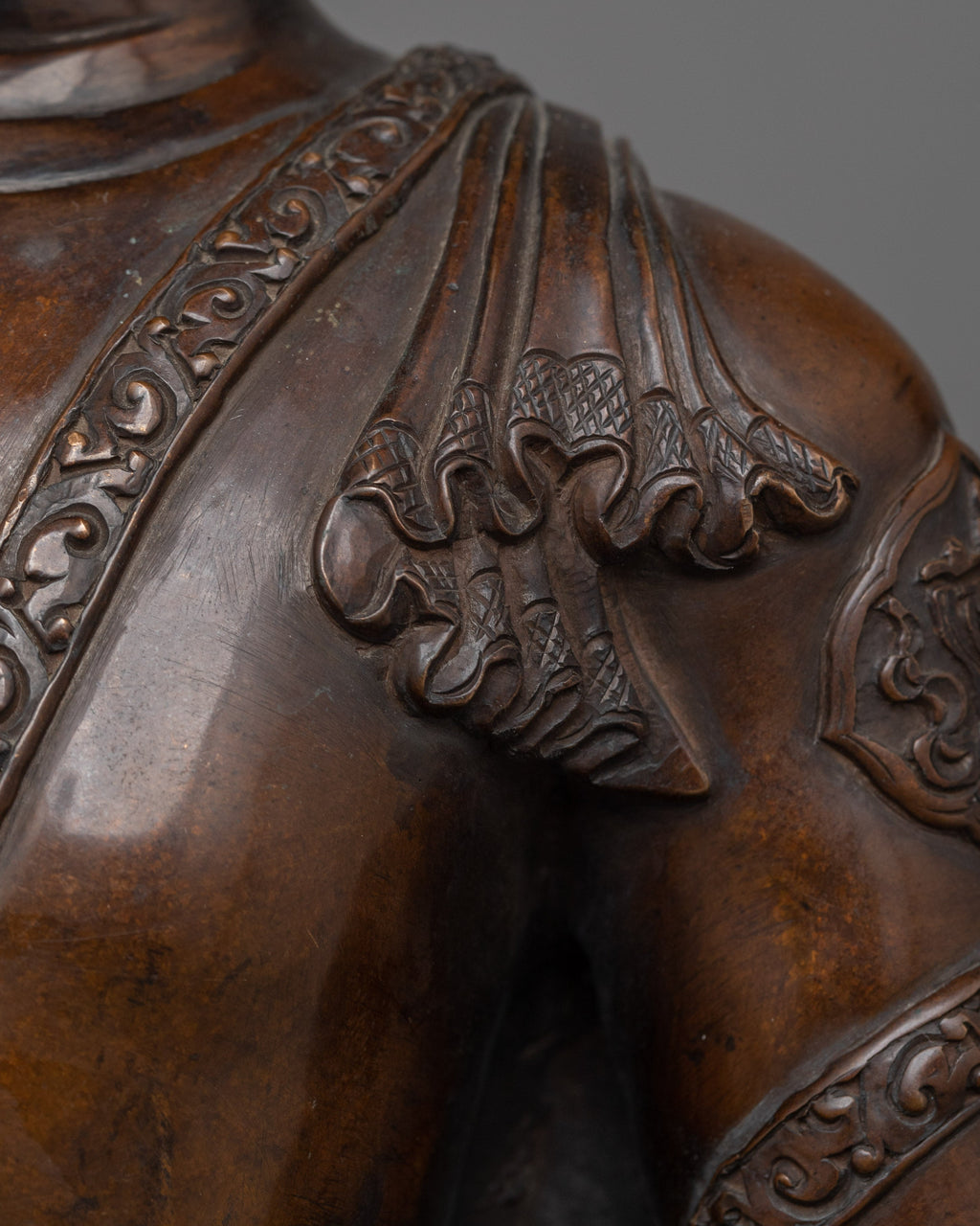 Shakyamuni Buddha is depicted sitting in the lotus pose (padmasana), indicating his steady concentration and mastery over the distractions of the material world. His right hand stretched toward the earth in bhumisparsha mudra, represents his moment of enlightenment, inviting the earth to witness his waking. The left hand, lying gently in his lap in dhyana mudra, depicts the profound state of meditation and mindfulness that leads to insight and clarity.