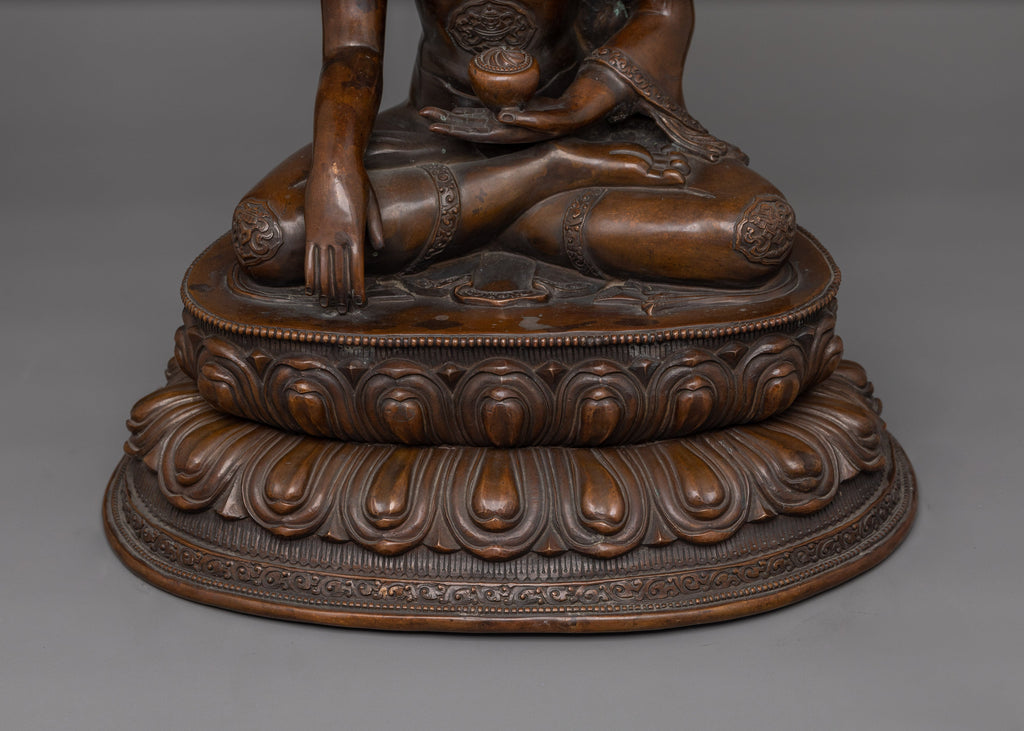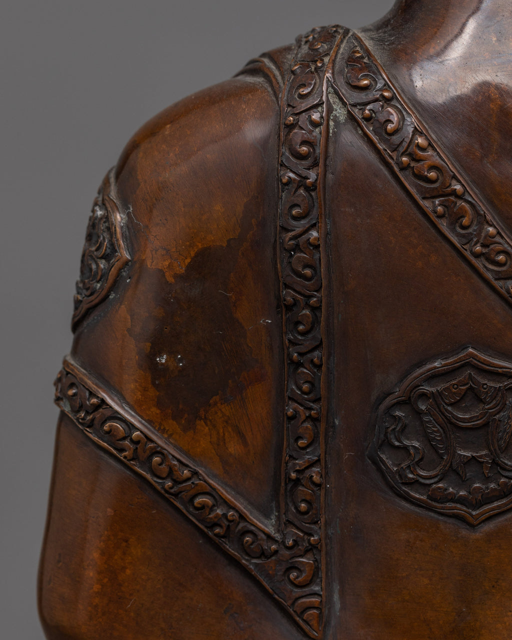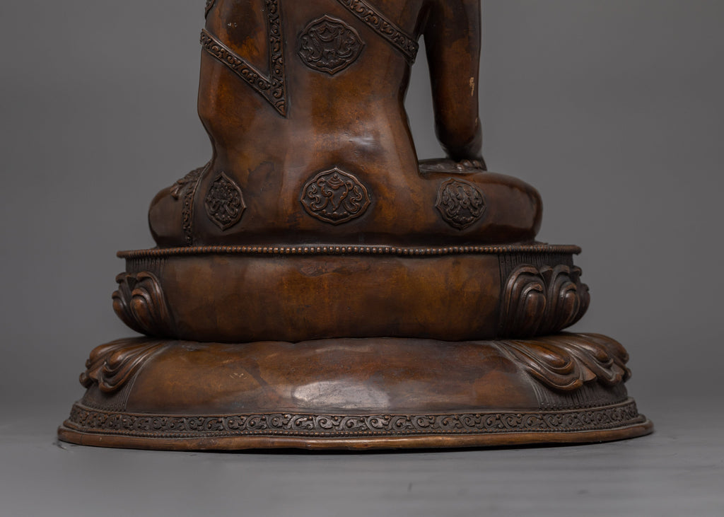 This Shakyamuni Buddha Founder of Buddhism Sculpture expresses the essence of knowledge, serene, and enlightenment. This statue, measuring 14.6" (Height) x 12.6" (Base) and weighing 6.87 kg, is skillfully carved from an oxidized copper body and adorned with acrylic paints that highlight its religious features. Every detail of this sculpture represents the rich creativity of Himalayan Buddhism, making it an ideal addition to altars, meditation rooms, or sacred collections.
