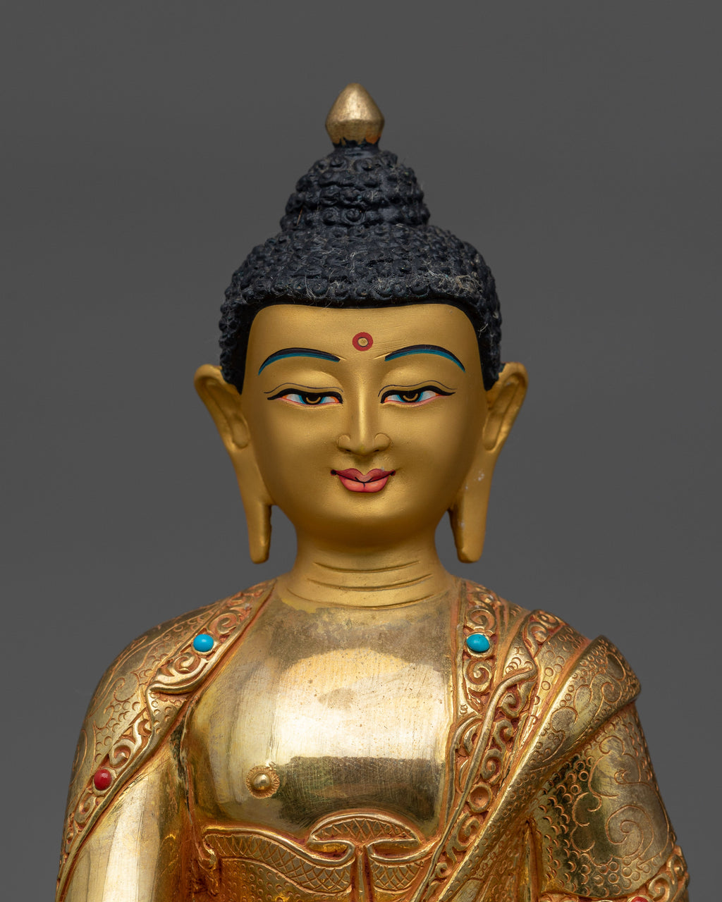 The Shakyamuni Buddha, Founder of Buddhism statue is a powerful symbol of wisdom, enlightenment, and the path to inner peace. This statue is made of copper and gilded with 24K gold. It stands 8.5"/21.5cm tall, has a base width of 5.9"/15cm, and weighs 1.61kg. Intricate gold and acrylic paintings complement their tranquil and enlightened demeanor. This statue serves as a reminder of the road to awakening, which includes meditation, awareness, and compassion.