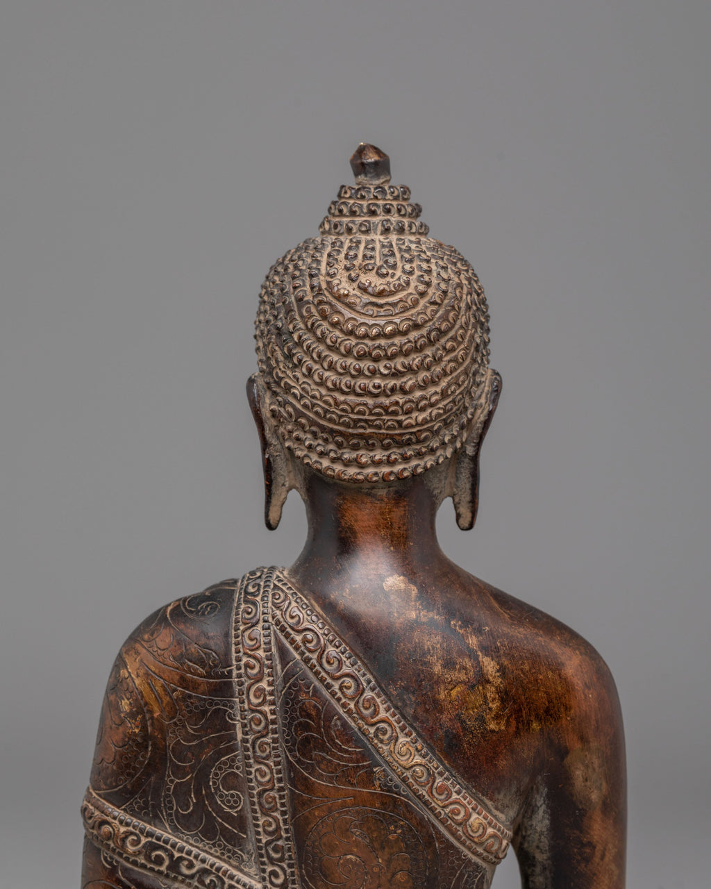 The figure's oxidized copper finish, which symbolizes the timeless essence of the Buddha's teachings, gives it a distinctive appearance. This statue serves as a constant reminder of the path to enlightenment, mindfulness, and compassion.