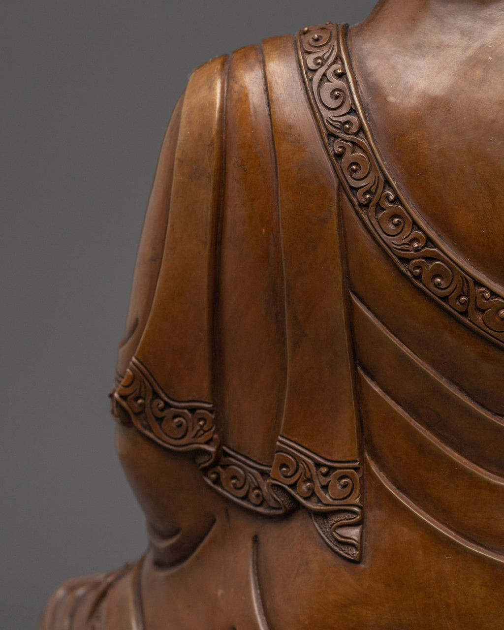 This Shakyamuni Buddha Peaceful Artwork measures 12.6 inches (32 cm) in height and 9.6 inches (24.5 cm) at the base, with a weight of 4.45 kg. Crafted from oxidized copper, the statue carries a serene and timeless finish that reflects inner peace and spiritual depth. Created by skilled Nepali artisans, it is a meaningful addition to any meditation space, altar, or contemplative setting, offering a sense of calm and inspiration rooted in Buddhist tradition.