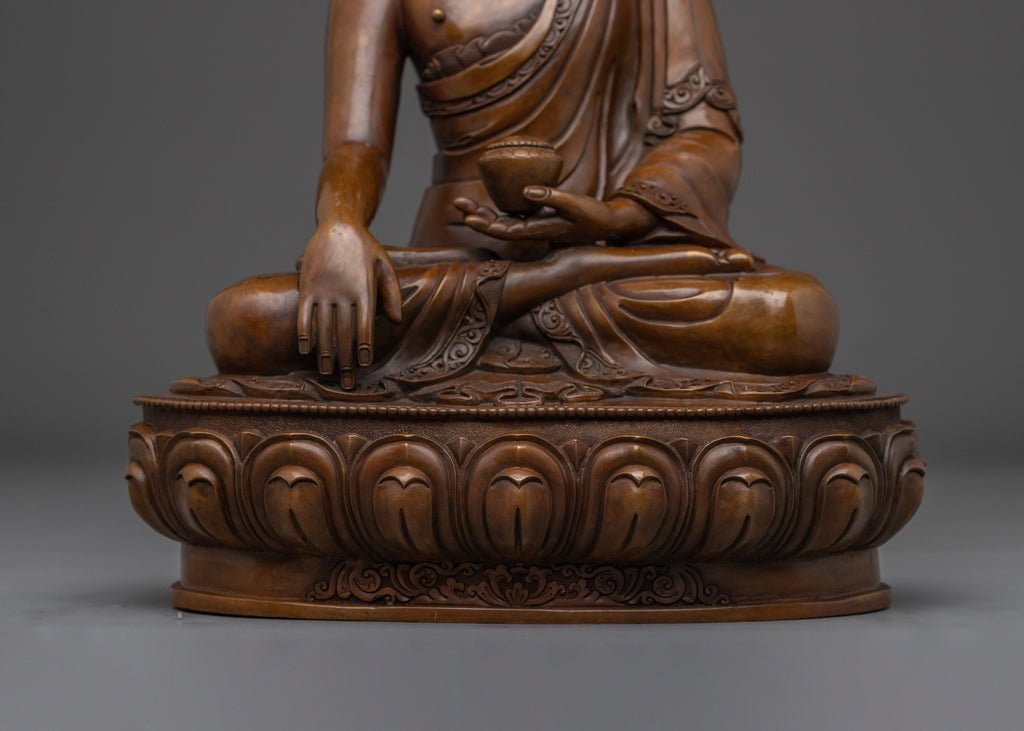 Shakyamuni Buddha is traditionally depicted with an ushnisha, the rounded bump on his head that signifies his profound spiritual wisdom and enlightenment. A well-known legend tells of snails that gathered on his head while he meditated, shielding him from the sun and demonstrating nature’s reverence for his spiritual dedication. In his left hand, he holds an alms bowl, representing a life rooted in simplicity, humility, and dependence on the kindness of others. His right hand performs the bhumisparsha mudra, or “earth-touching” gesture, symbolizing the moment he called upon the earth to witness his enlightenment beneath the Bodhi tree. Seated in the stable vajra posture on a lotus base shaped like a moon disc—an emblem of purity and awakening—he is draped in a modest monastic robe that reflects his renunciation and compassion. As the founder of Buddhism, Shakyamuni Buddha embodies the core values of spiritual awakening, humility, and universal compassion.
