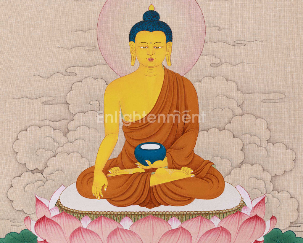 Discover a serene and distinctive portrayal of the historical Buddha through this Shakyamuni Buddha Peaceful Thangka, designed to foster deep reflection and inner tranquility. In contrast to conventional thangkas, this exceptional work features a tranquil backdrop of gentle clouds that accentuate the Buddha’s serene presence and foster a sense of calm. Created by hand at our Enlightenment Studio, this thangka is produced using premium cotton canvas, natural Lhasa stone pigments, and authentic 24K gold, thereby guaranteeing both visual brilliance and spiritual fidelity. The delicate shimmer of the gold accents imbues the Buddha’s depiction with a luminous quality, embodying the divine energy associated with enlightenment.