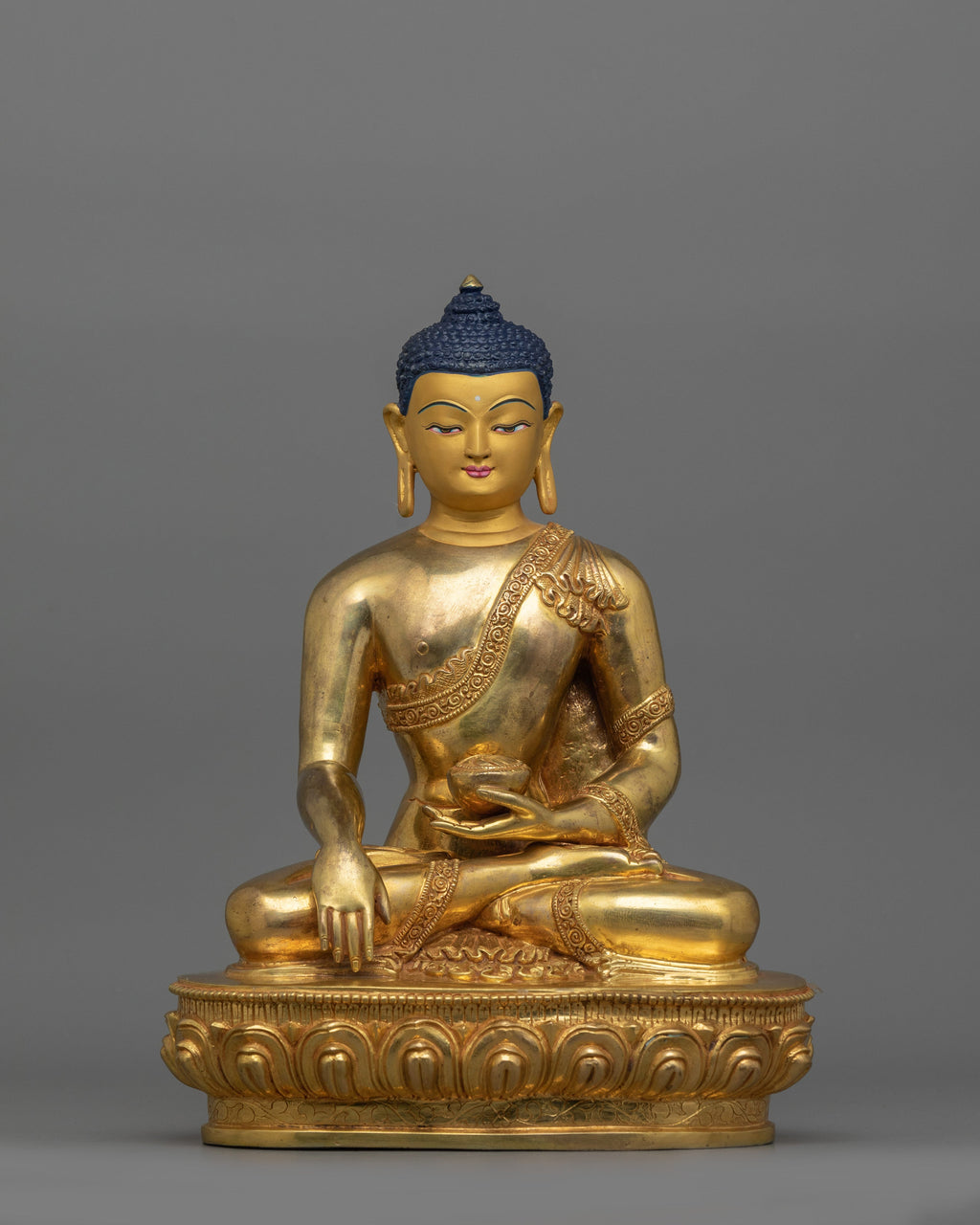 Shakyamuni Buddha is depicted sitting in the lotus pose (padmasana), indicating his steady concentration and mastery over the distractions of the material world. His right hand stretched toward the earth in bhumisparsha mudra, represents his moment of enlightenment, inviting the earth to witness his waking. The left hand, lying gently in his lap in dhyana mudra holding an alms bowl depicts the profound state of meditation and mindfulness that leads to insight and clarity.