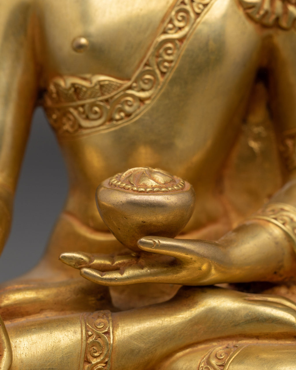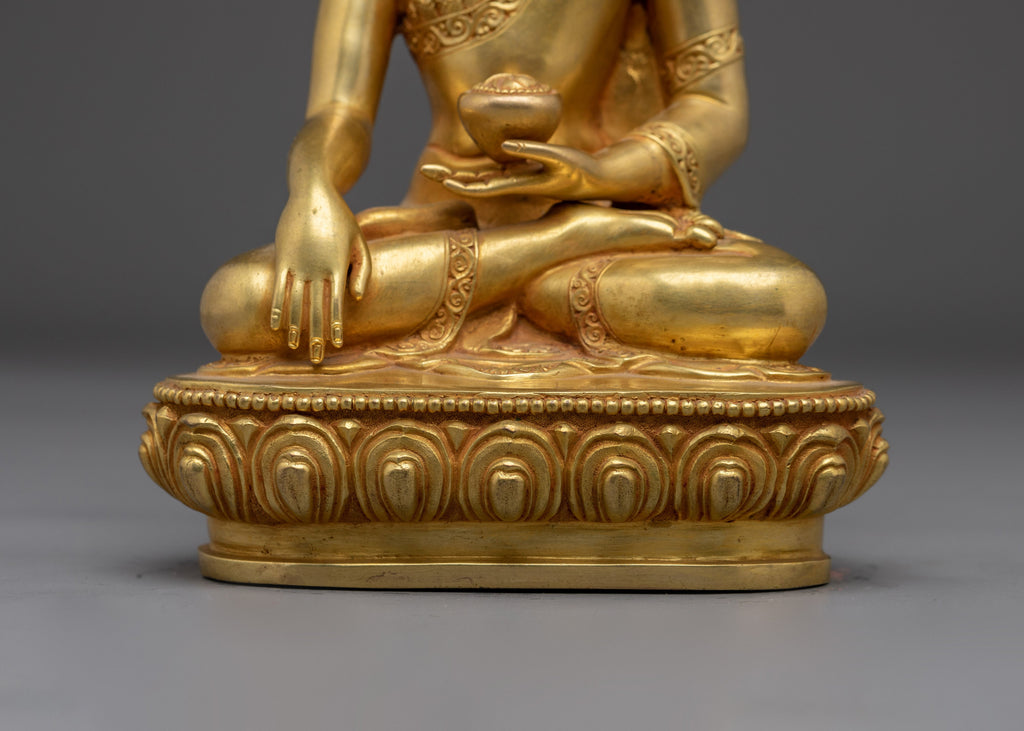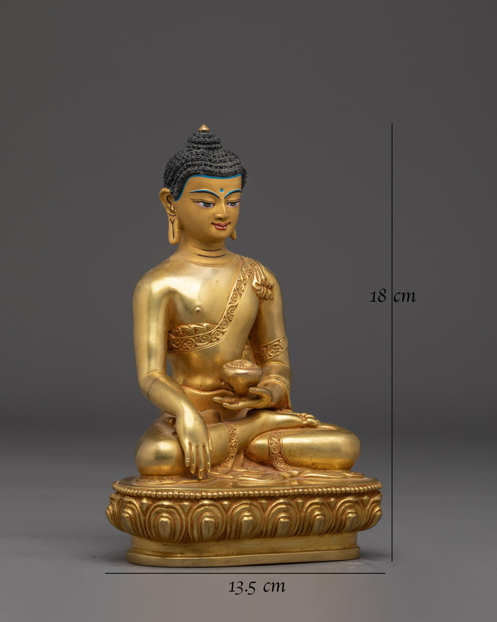 Shakyamuni Buddha is captured in serene meditation, his half-closed eyes glowing with calm wisdom and awakened understanding. His right hand touches the earth in the bhūmisparśa mudrā, summoning the Earth to witness his enlightenment. Resting gently in his left hand is a delicate alms bowl, symbolizing humility and renunciation. Crowning his head is the ushnisha, a sign of supreme wisdom, while his snail-coiled hair tells the charming tale of snails shielding him from the sun during long meditations. Seated gracefully in the vajra posture atop a moon disc lotus, he embodies purity, stability, and focused tranquility—an artistic tribute to the timeless Buddha.