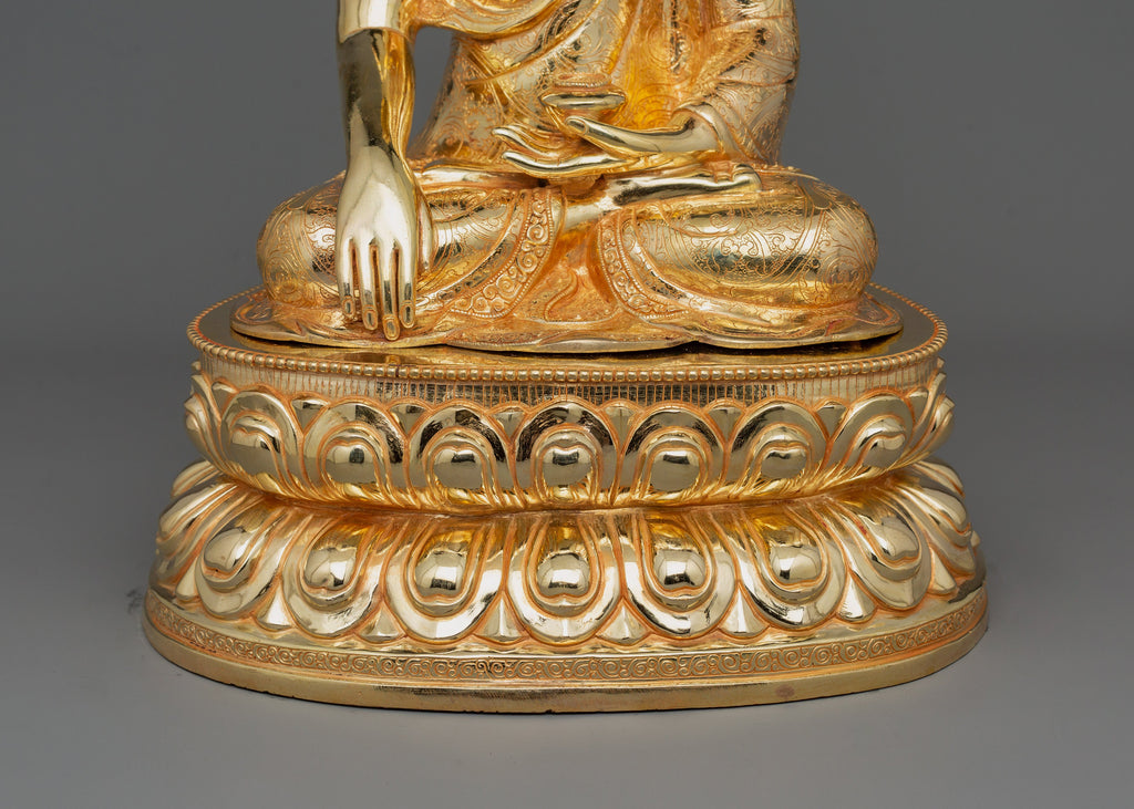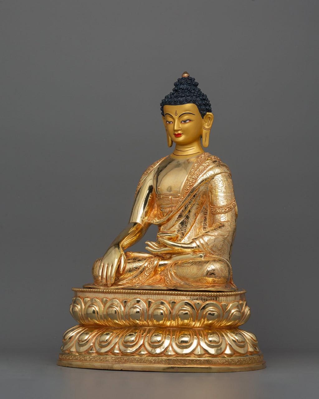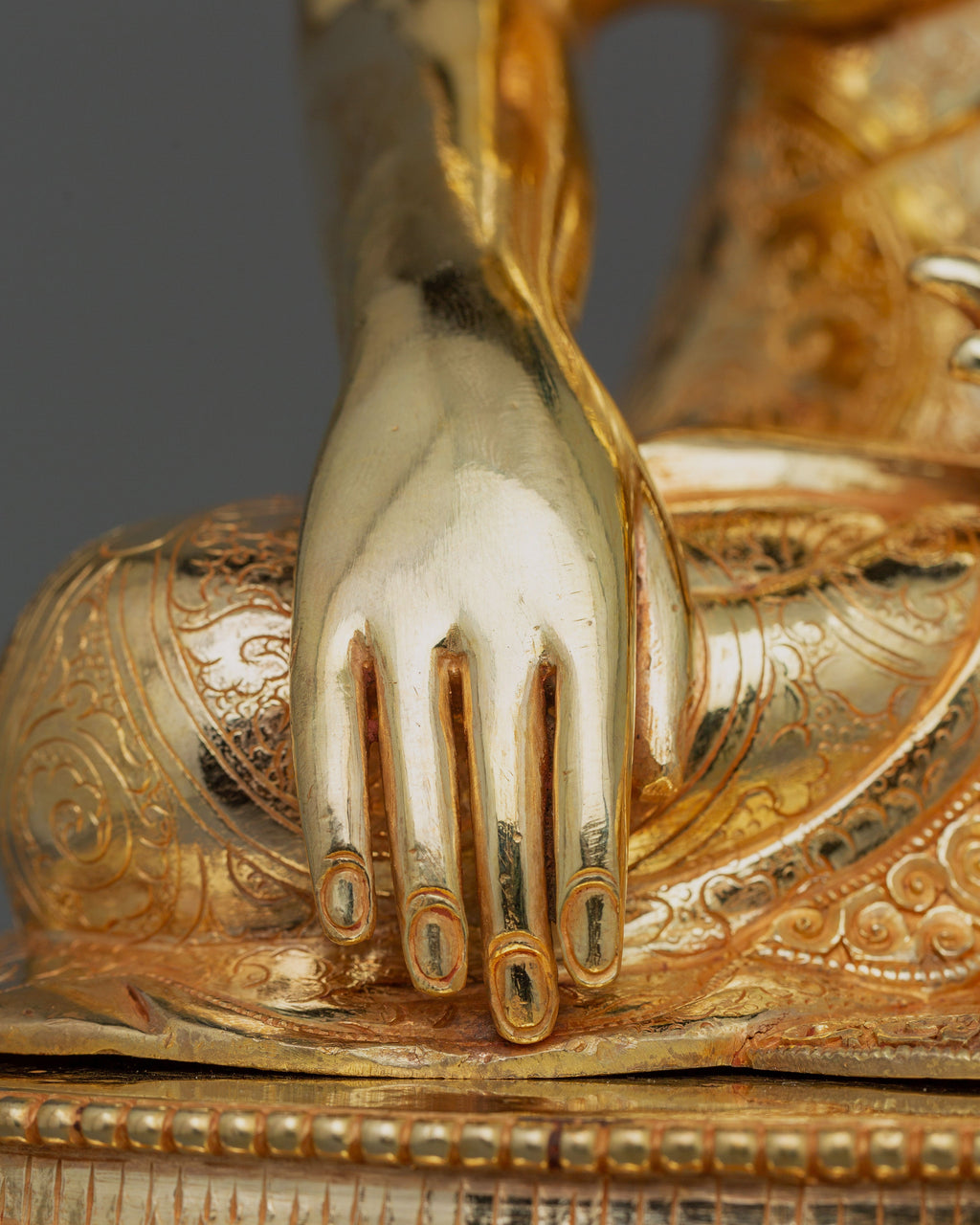 Shakyamuni Buddha is shown sitting in the lotus pose (padmasana), showing his unwavering attention and mastery over the distractions of the material world. His right hand, extending toward the soil in bhumisparsha mudra, symbolizes his moment of enlightenment, inviting the world to witness his awakening. The left hand, softly reclining in his lap in dhyana mudra, represents the deep meditation and mindfulness level leading to insight and clarity.