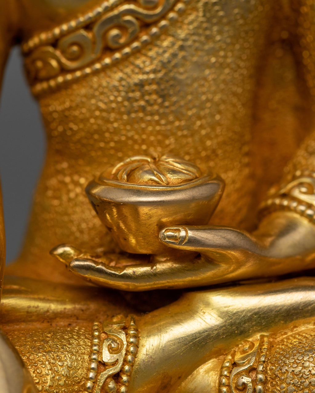 Shakyamuni Buddha is depicted sitting in the lotus pose (padmasana), indicating his steady concentration and mastery over the distractions of the material world. His right hand stretched toward the earth in bhumisparsha mudra, represents his moment of enlightenment, inviting the earth to witness his waking. The left hand, lying gently in his lap in dhyana mudra holding an alms bowl depicts the profound state of meditation and mindfulness that leads to insight and clarity.