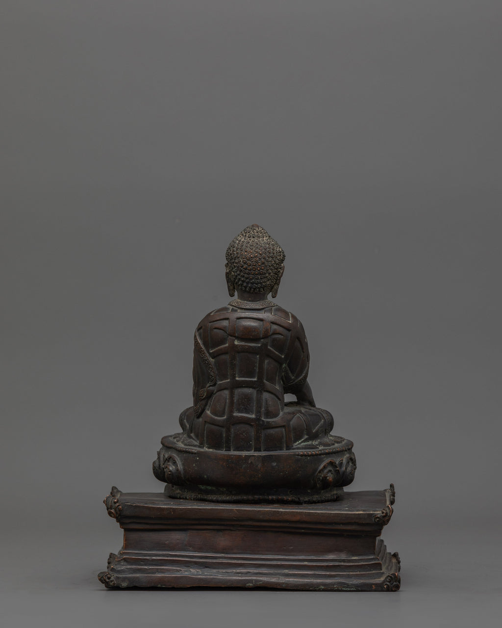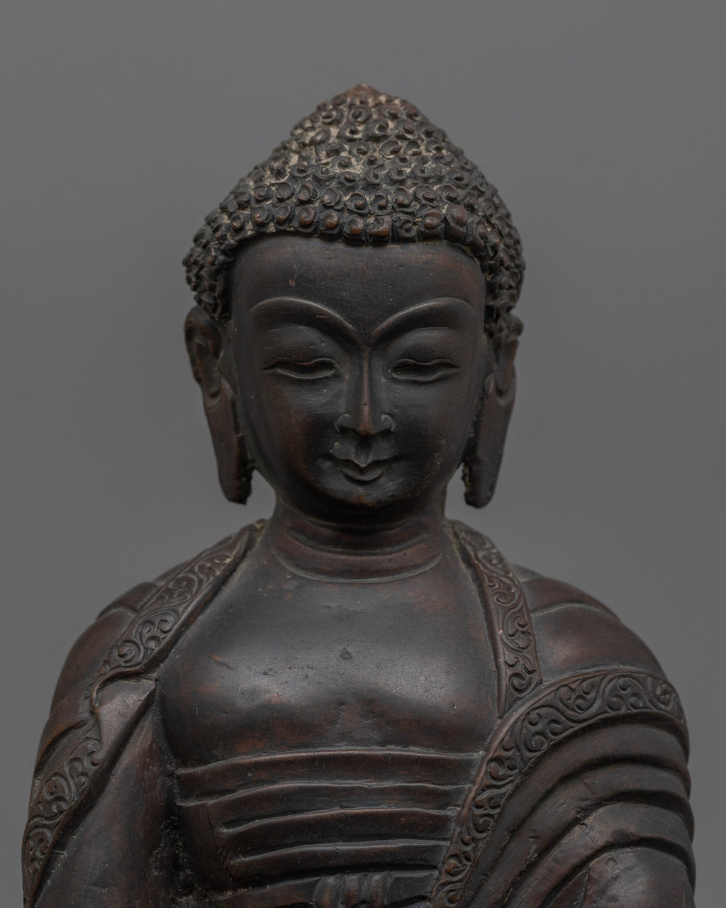 The Shakyamuni Buddha Spiritual Wisdom Figurine, symbolizes the Buddha's deep teachings and the path to spiritual awakening. This handcrafted statue is 10.8" (Height) x 7.5" (Base) and weighs 2.95 kg. It is made of oxidized copper. This sacred statue, created by expert Nepalese artisans, represents the craftsmanship of Himalayan Buddhism, making it an inspirational addition to altars, meditation places, or sacred collections.