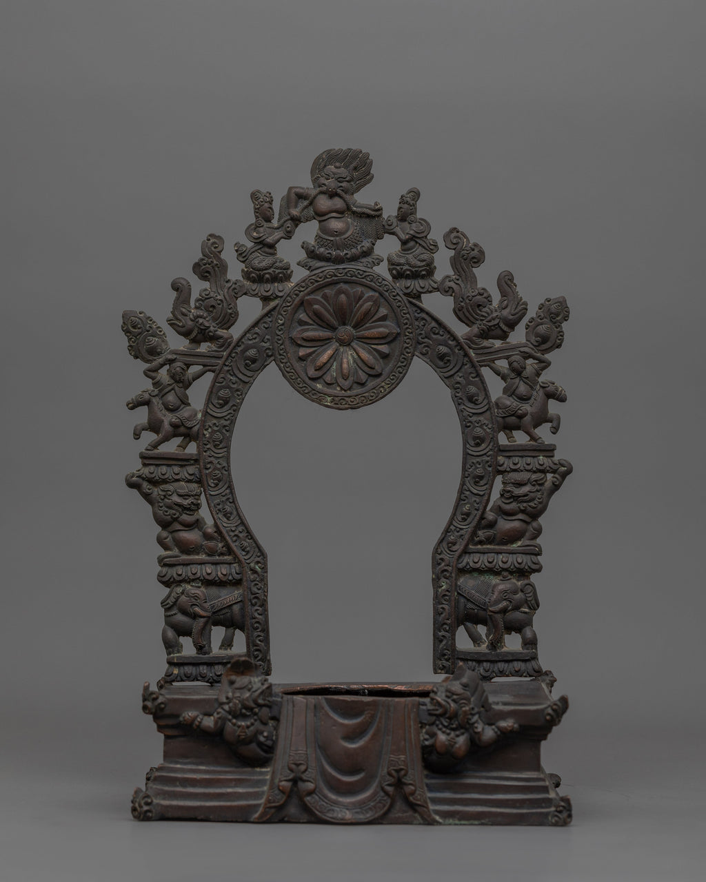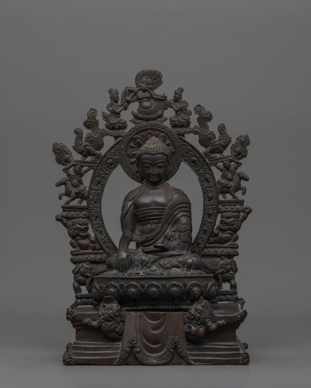 The shakyamuni statue is often depicted seated on an exquisitely designed throne, embodying serenity and divine grace. The throne itself is a work of art, symbolizing reverence and sanctity. It is adorned with intricate carvings, and auspicious symbols, representing the profound teachings of Buddhism. Often embellished with oxidized copper, the throne highlights the skill of master artisans who bring it to life with intricate detailing and symmetrical patterns.