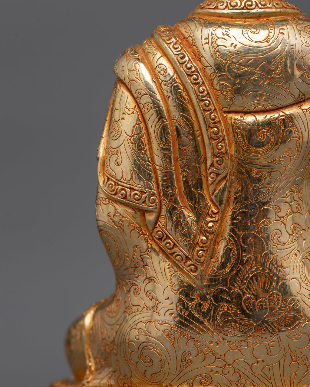Shakyamuni Buddha is depicted sitting in the lotus pose (padmasana), indicating his steady concentration and mastery over the distractions of the material world. His right hand stretched toward the earth in bhumisparsha mudra, represents his moment of enlightenment, inviting the earth to witness his waking. The left hand, lying gently in his lap in dhyana mudra, depicts the profound state of meditation and mindfulness that leads to insight and clarity.