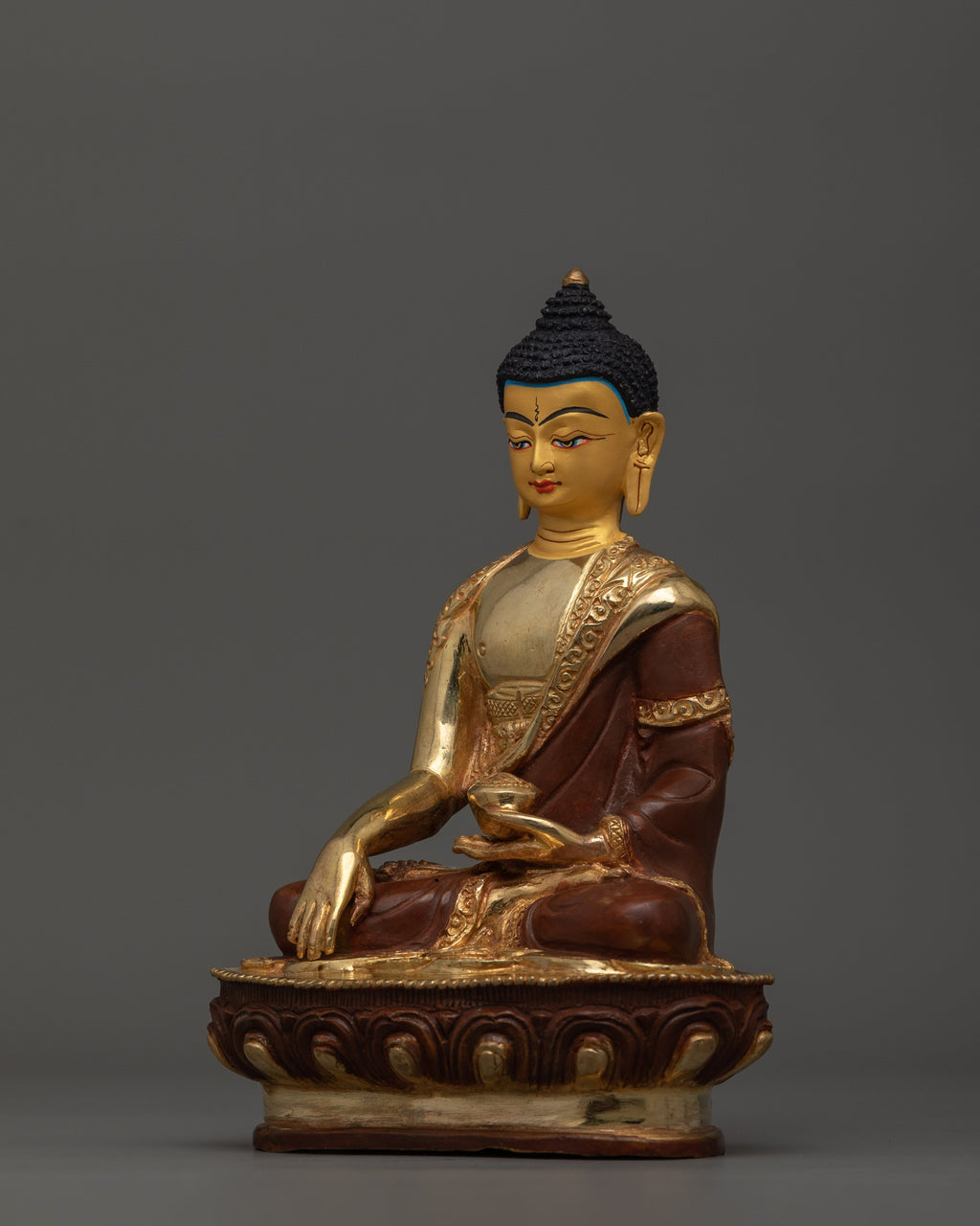 This Shakyamuni Buddha statute for Peace Decor weighs 1.19 kg and measures 7.9"/20 cm (Height) x 5.5"/14 cm. It is meticulously crafted from a Mercury Gold Gilded Copper Body and embellished with gold and acrylic paintings, displaying a perfect blend of craftsmanship and spirituality. Its small size and delicate decorations make it an ideal complement to personal altars, meditation places, or as a spiritual gift.