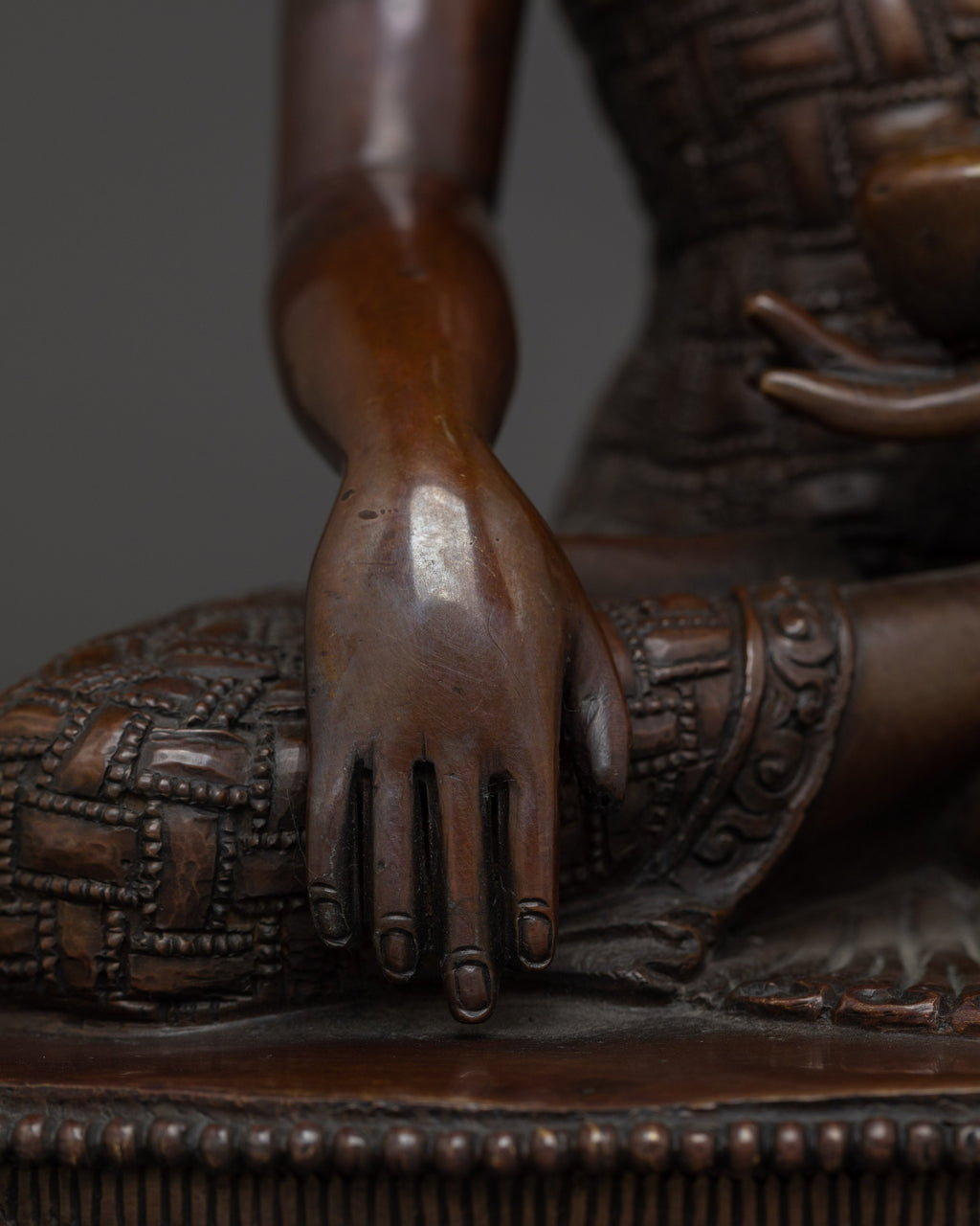 This exquisite 11.4-inch Shakyamuni Buddha Statue in Oxidized Copper, handmade of oxidized copper, exudes timeless calmness and grounded spiritual presence. The dark patina created by expert artisans in Nepal gives it a warm, earthy tone, making it great for tranquil areas, rustic altars, or elegant meditation corners.
