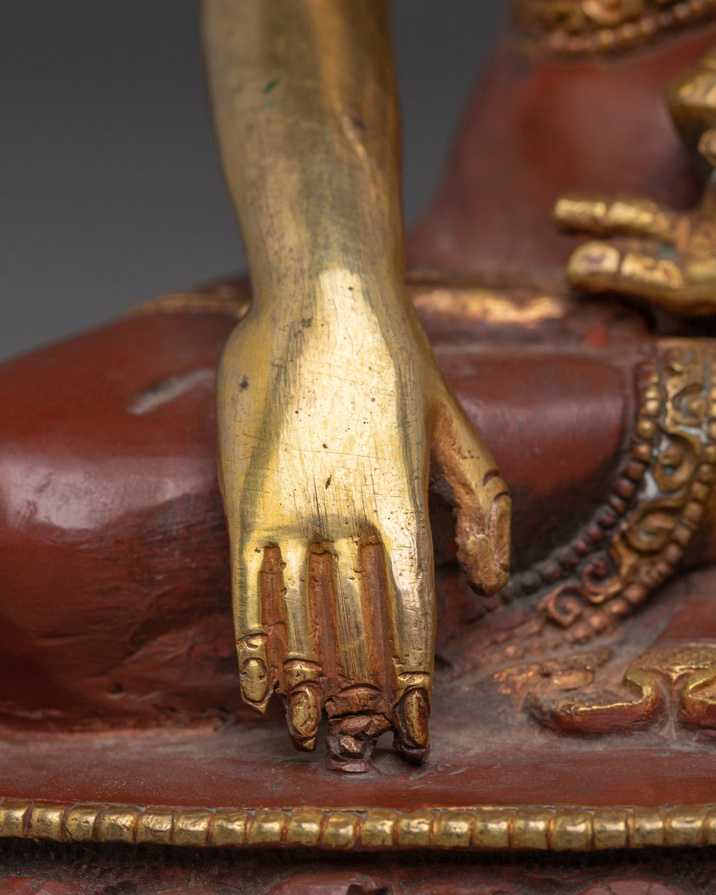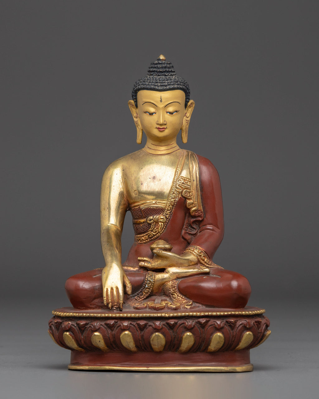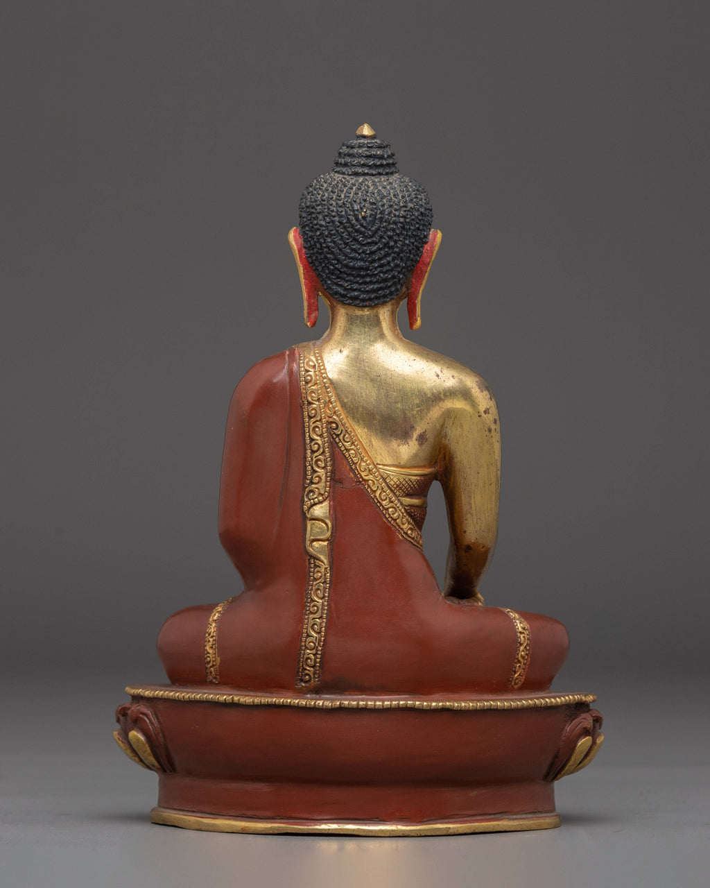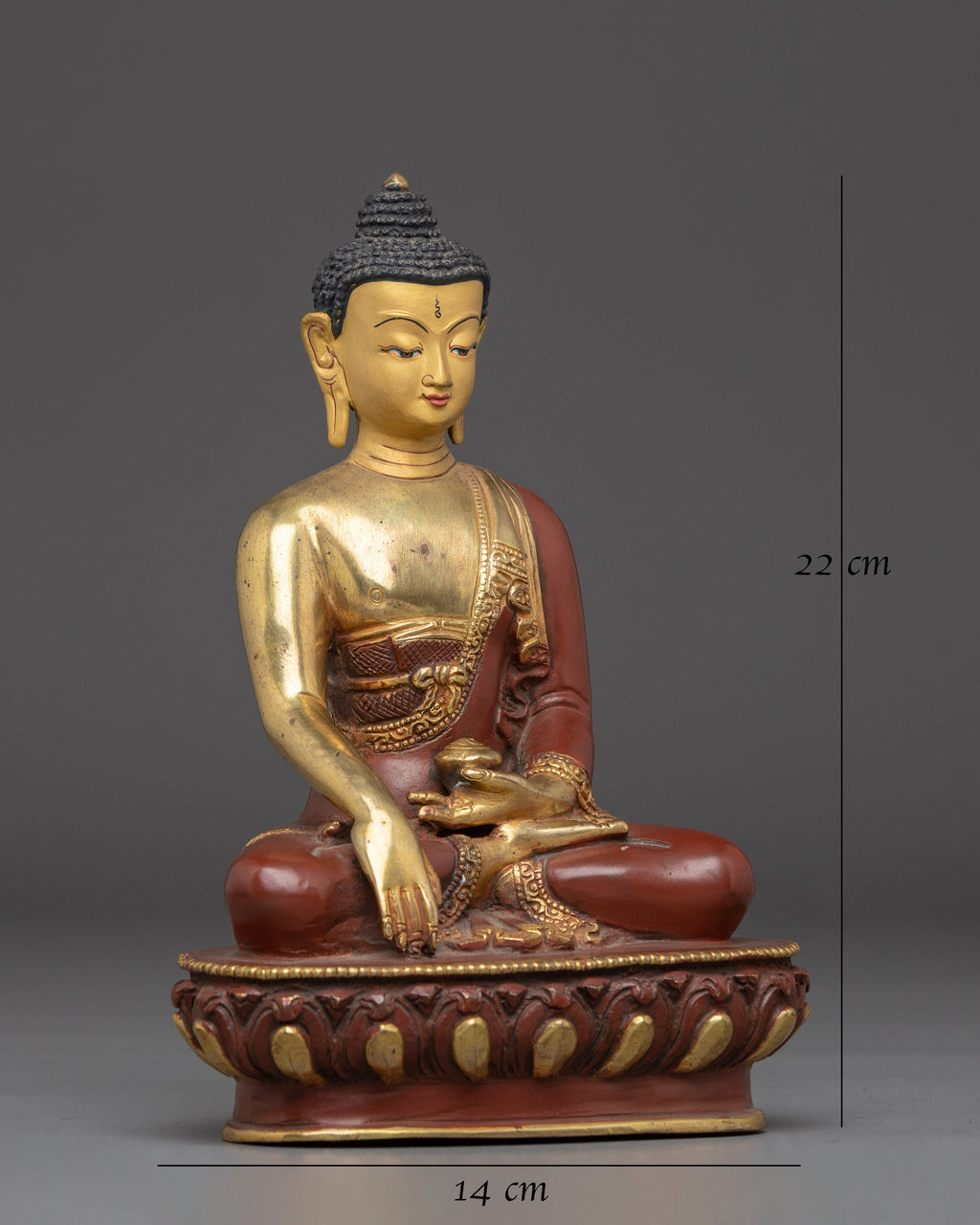 This Shakyamuni Buddha Statue is 7.9 inches (22 cm) tall, with a base width of 5.5 inches (14 cm), and it weighs 1.07 kg. The statue is made from a copper body, adorned with 24K gold gilding, and enhanced with gold and acrylic paintings. It is handcrafted by skilled Nepali artisans, reflecting traditional workmanship.