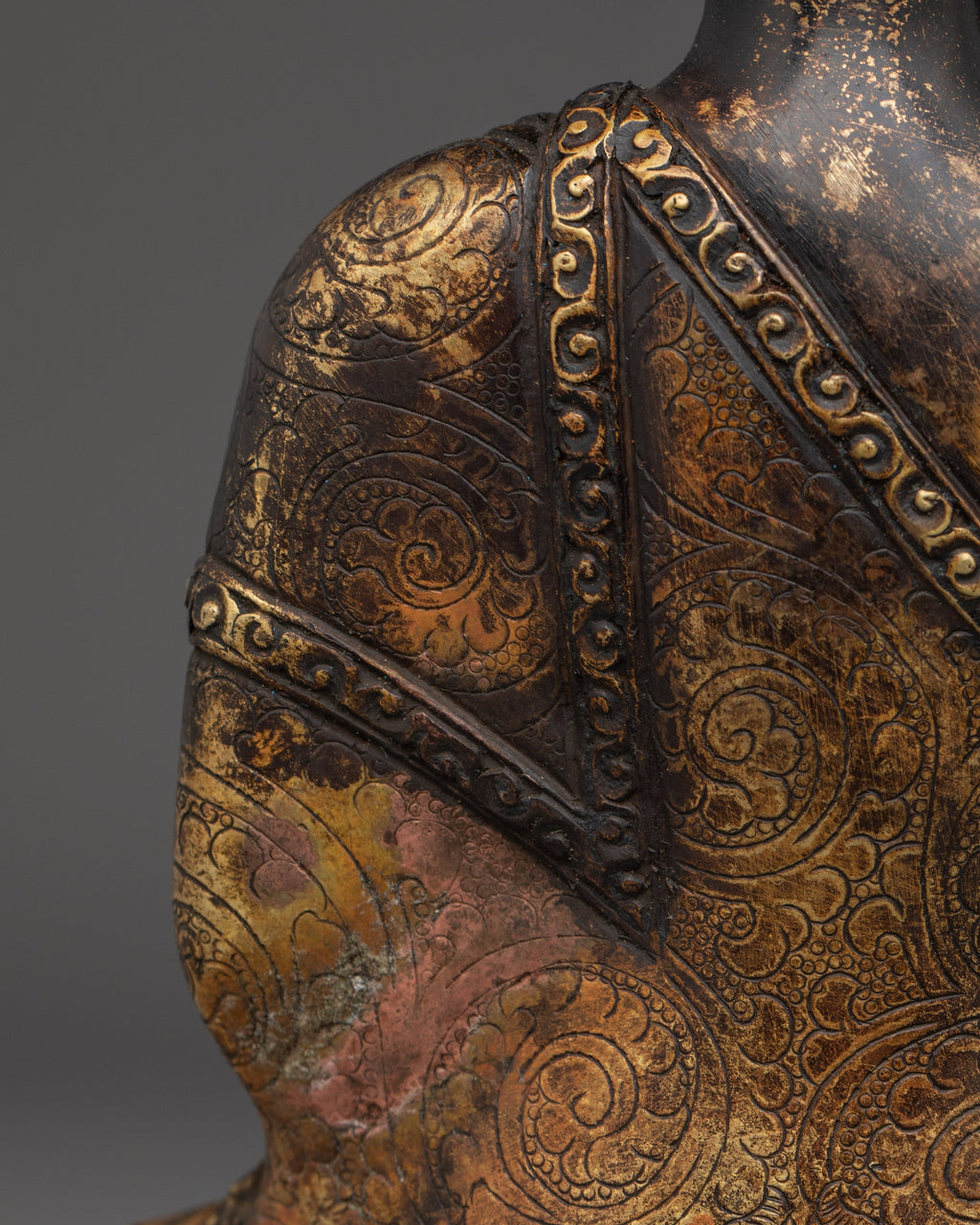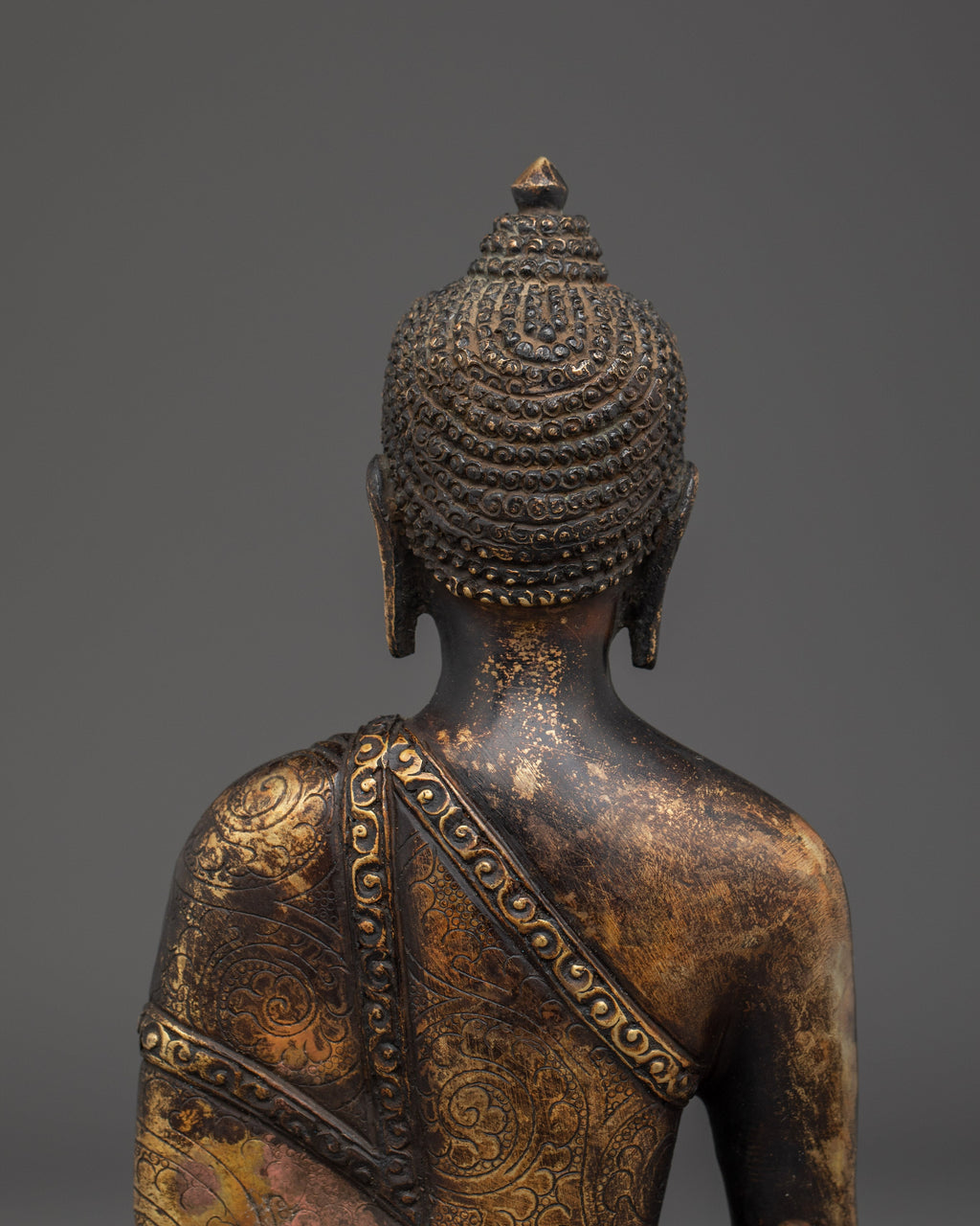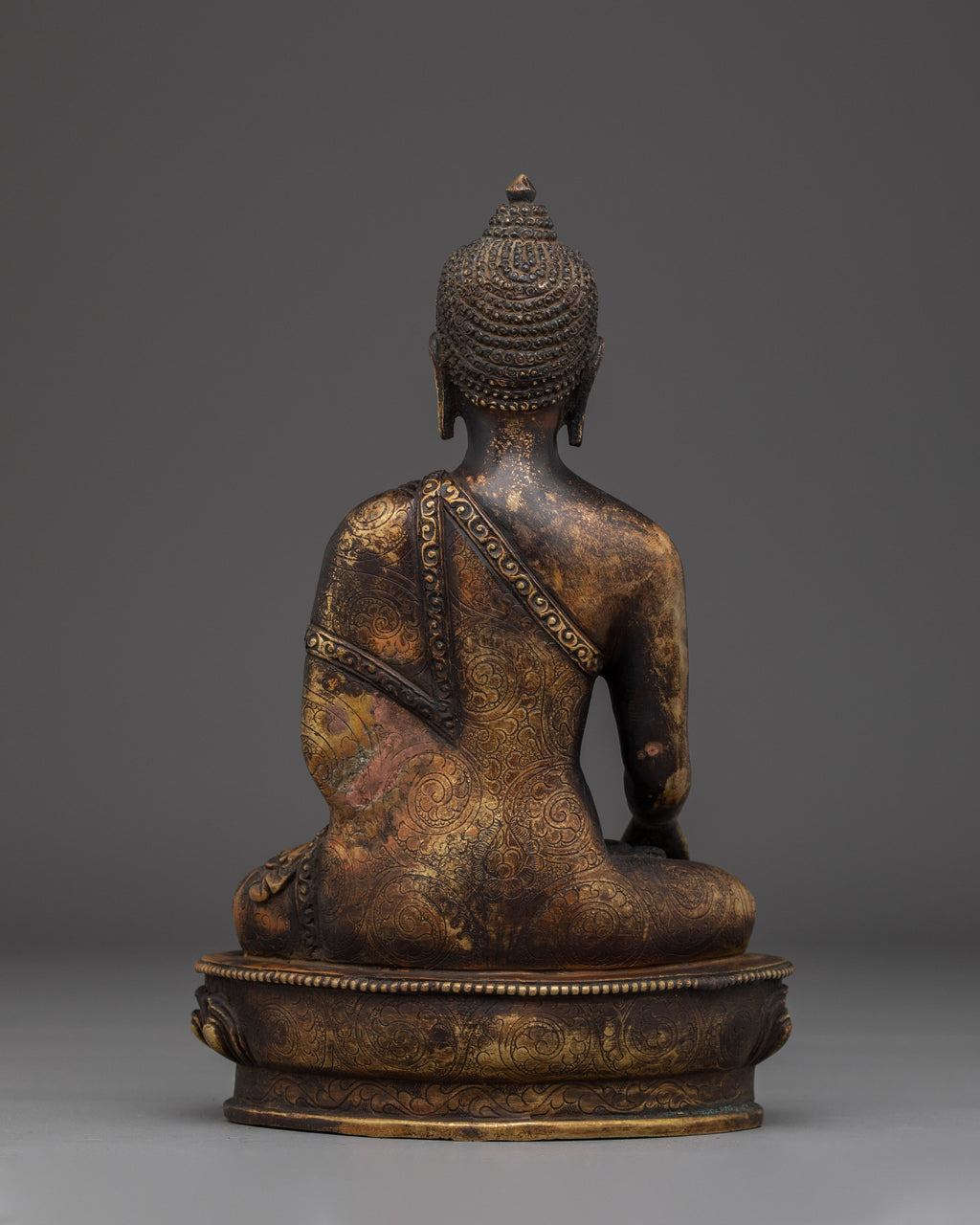 The statue depicts Shakyamuni Buddha seated in the padmāsana (lotus posture), with his right hand in the bhūmisparsa mudra (earth-touching gesture) and his left hand holding an alms bowl, symbolizing his renunciation and attainment of enlightenment. His head features the uṣṇīṣa, a cranial protuberance that signifies wisdom, and he wears monastic robes with elongated earlobes, representing his royal heritage. He is seated upon a moon disc atop a lotus base, reflecting purity and spiritual awakening.