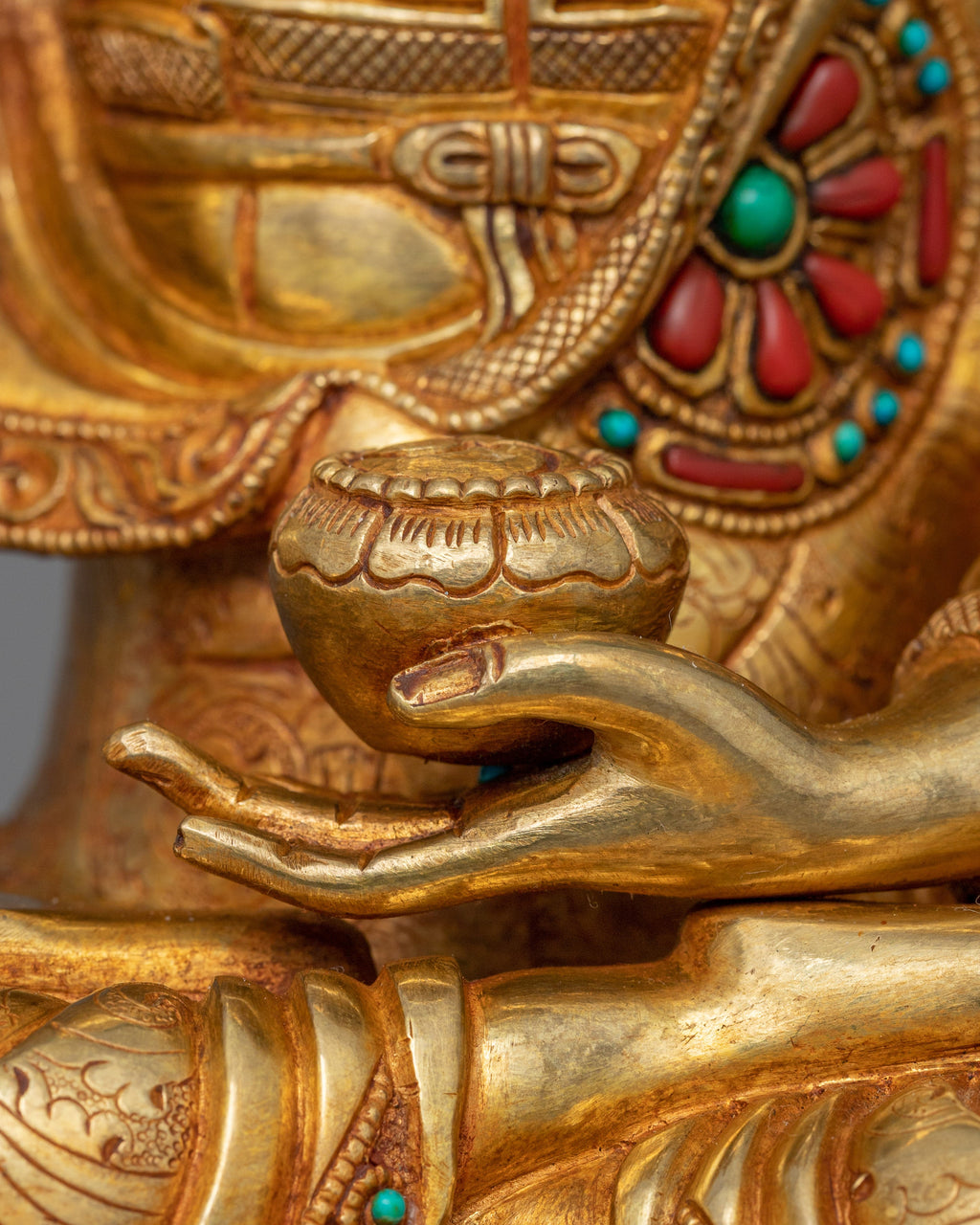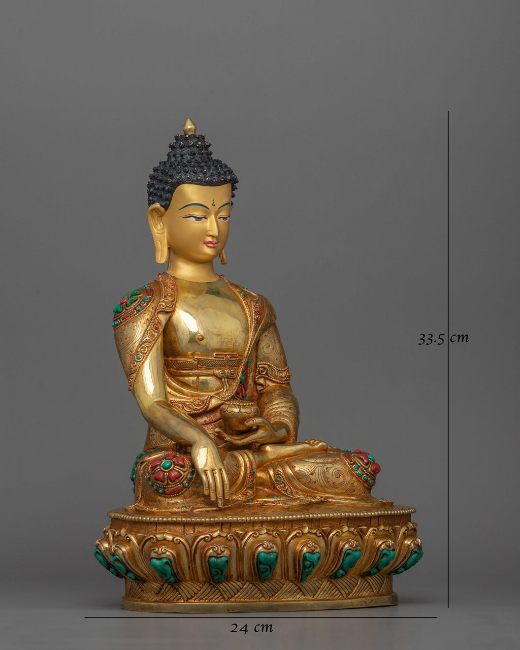 This Shakyamuni Buddha Teachings Statue represents enlightenment and profound knowledge, representing compassion, awareness, and spiritual awakening. This handcrafted statue measures 13.2" (Height) x 9.4" (Base) and weighs 4.26 kg. It is made of copper and is adorned with 24K gold gilding, gold and acrylic paints, and hand-carved gemstones. This statue, handcrafted by expert craftsmen in Nepal, represents the sacred beauty of Himalayan Buddhism, making it an inspirational addition to altars, meditation areas, or sacred collections.