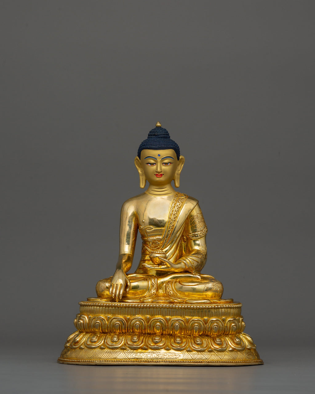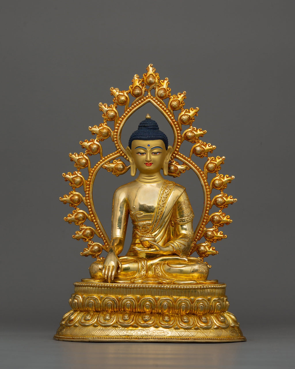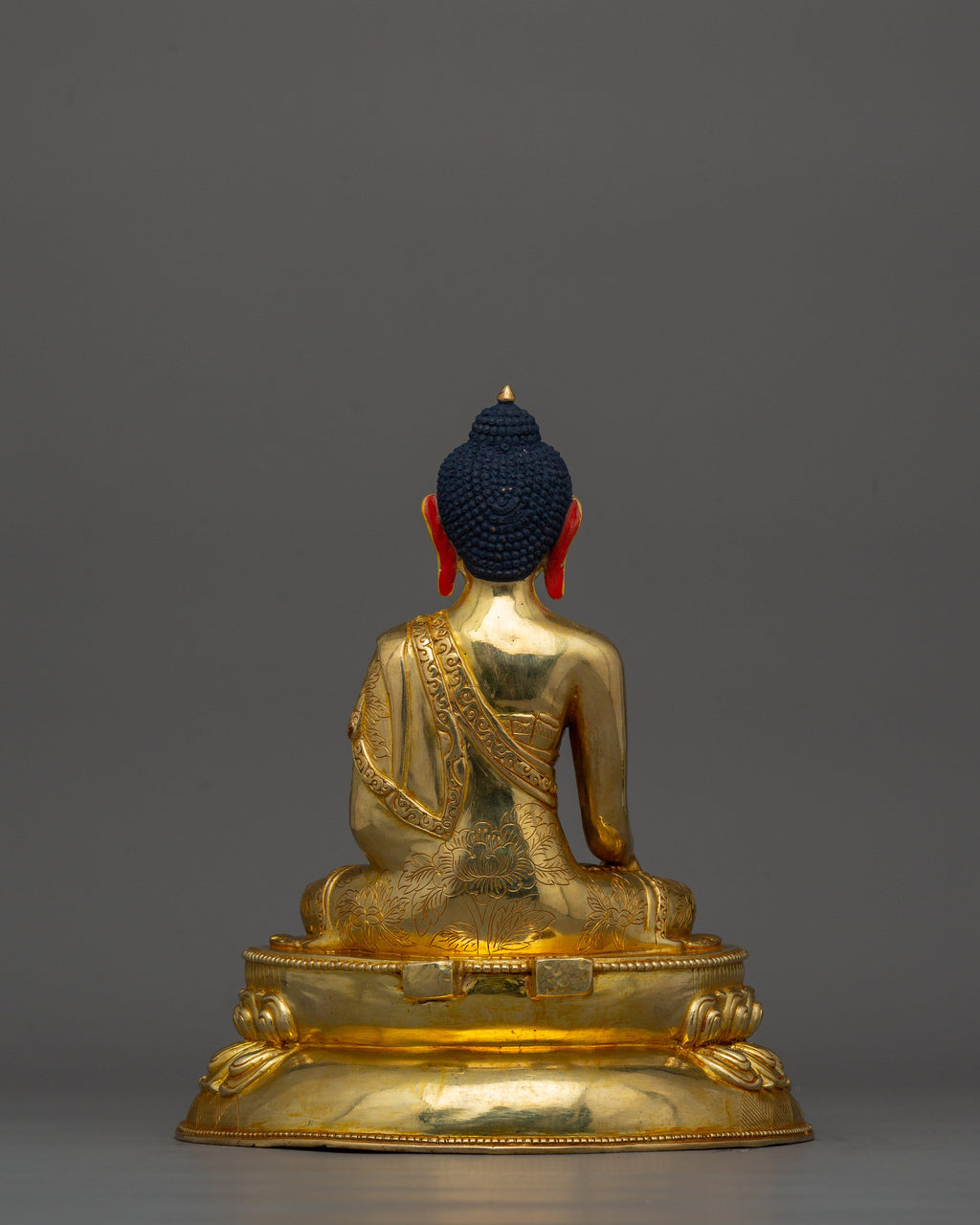 This handcrafted statue symbolizes Shakyamuni Buddha with a sacred halo. It measures 12" (Height) x 8.3" (Base) and weighs 2.95 kg, crafted of copper, gilded in 24K gold, and adorned with gold and acrylic paints. Crafted by expert Nepalese craftsmen, this stunning sculpture embodies the spiritual and creative quality of Himalayan traditions, making it an inspirational addition to altars, meditation areas, or sacred collections.