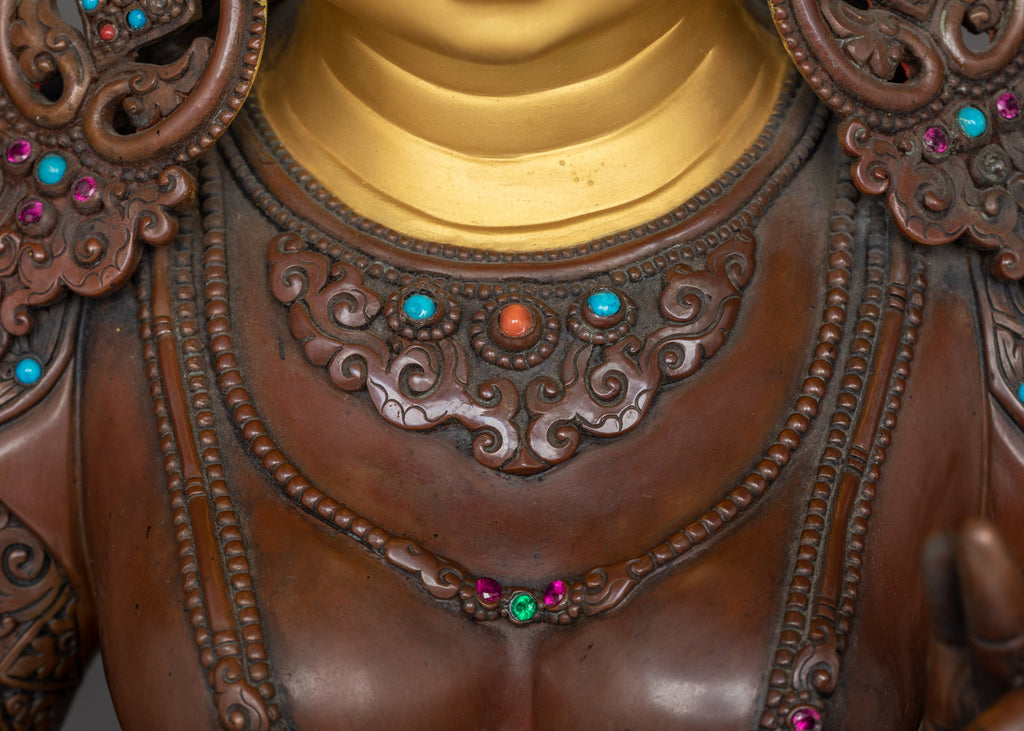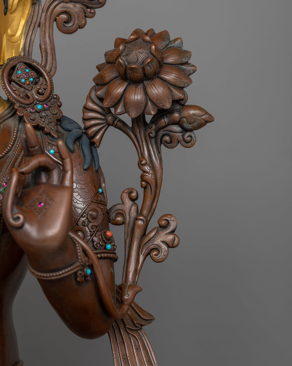 The monument of Green Tara is more than just a work of art; it is a potent representation of proactive kindness and defense. Her elaborate jewelry and flowing robes' textures are brought to life by the oxidized finish, which also accentuates her fine features and spiritual qualities. This statue is perfect for adding a peaceful, feminine aura to meditation rooms, spiritual centers, or any other area used for contemplative practice.