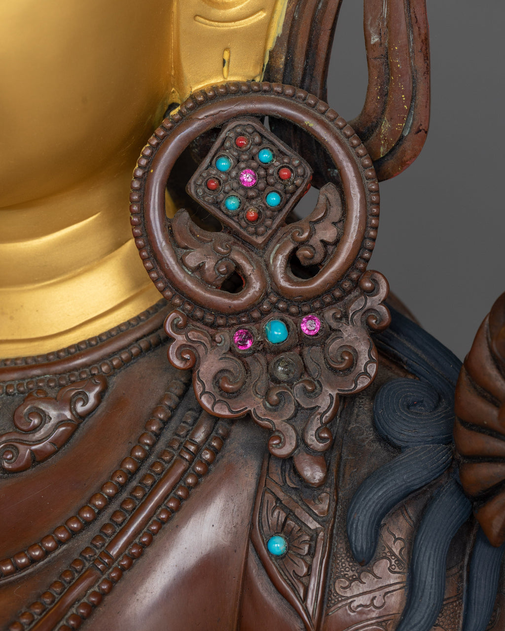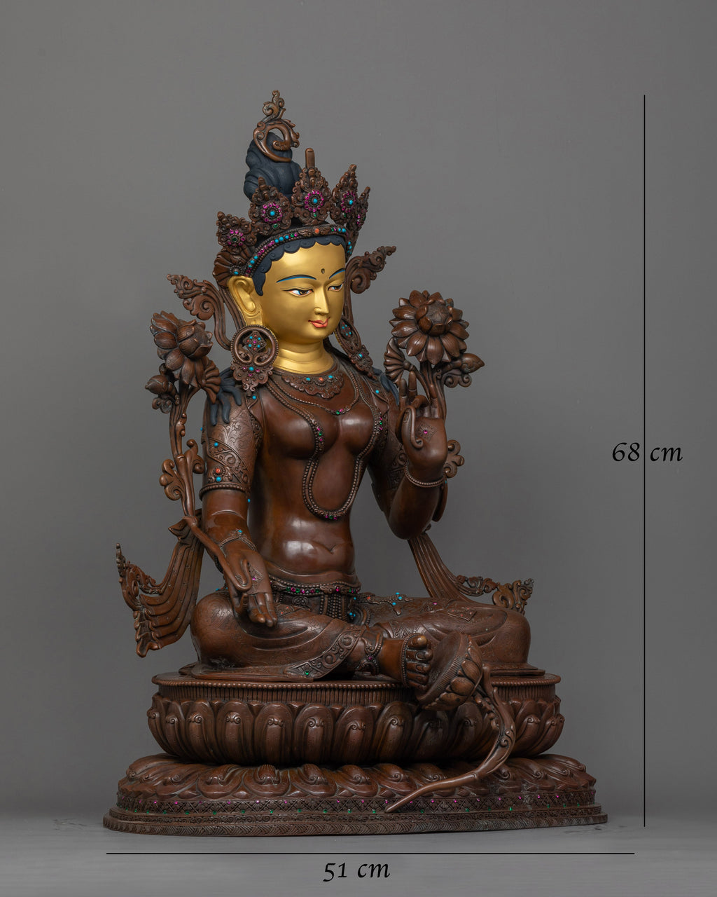 Introducing the Shri Green Tara Oxidized Statue's gorgeous presence and deep spirituality into your surroundings. With a height of 26.8 inches and a hefty base measuring 20.1 inches, this remarkable item is expertly made from an oxidized copper body, giving it an aged, vintage appearance. This statue, enhanced by paintings in gold and acrylic and adorned with gemstones, depicts Green Tara in her traditional action-ready stance, signifying her dedication to easing suffering and assisting beings on their path to enlightenment.