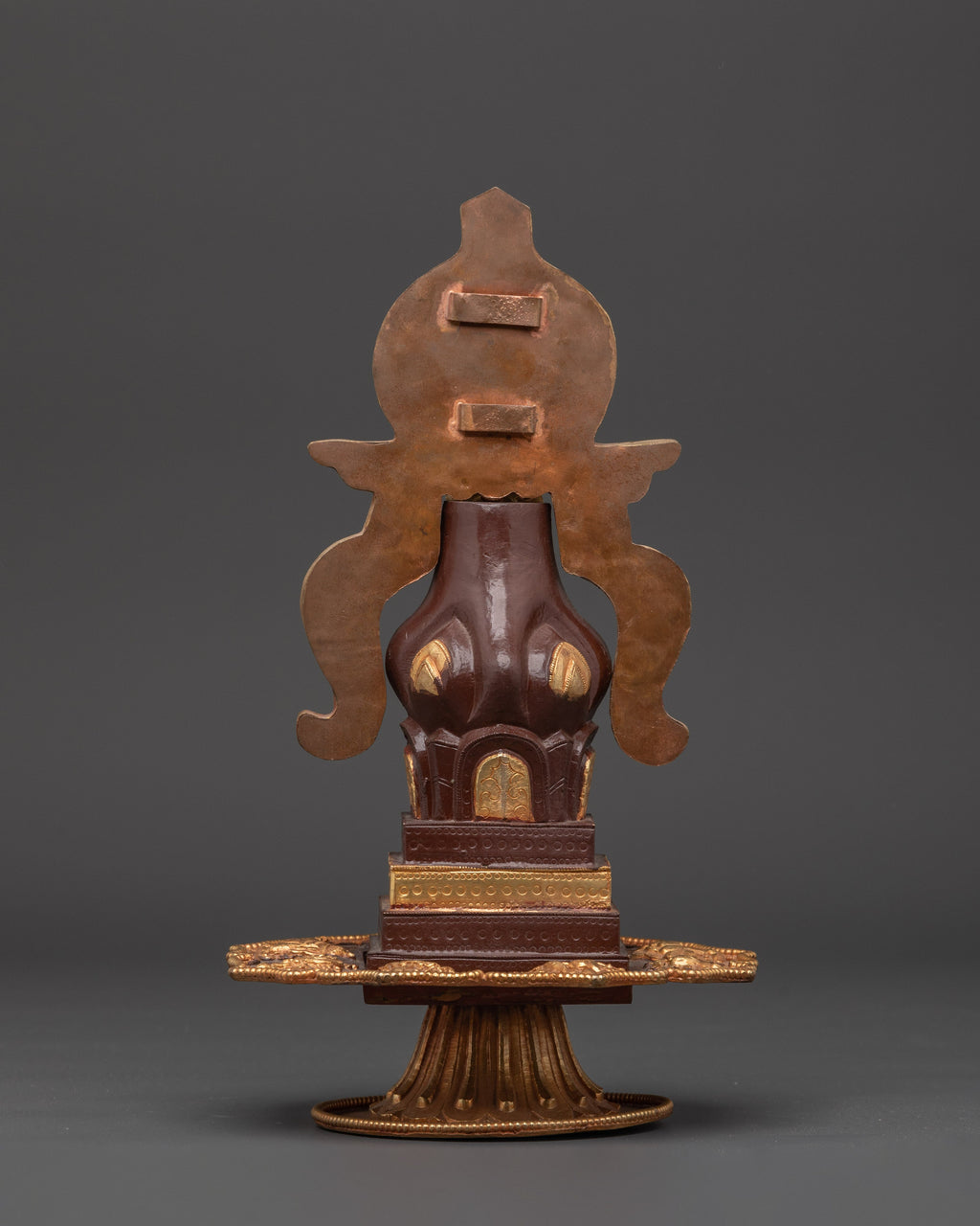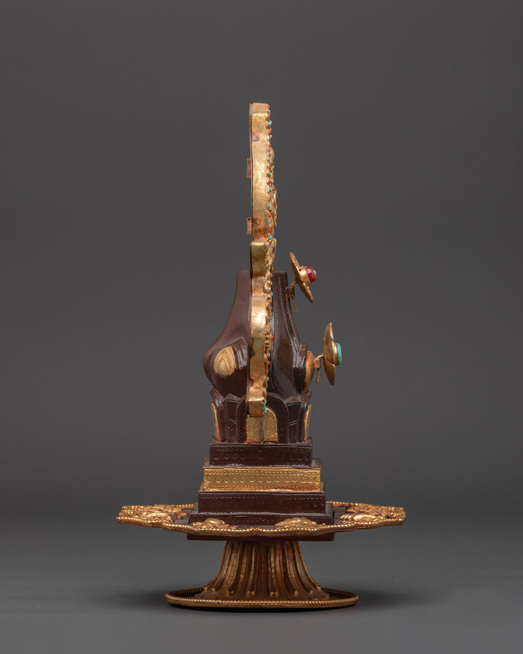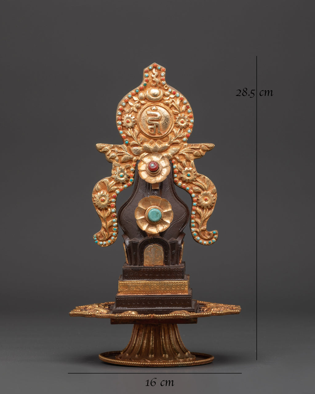 Elevate your spiritual practice with this exquisitely handcrafted Shrine Torma, a sacred artifact designed with meticulous precision and deep reverence. Measuring 28.5 cm in height and 16 cm in width, it is crafted from copper and enhanced with a gold plating that adds timeless elegance. The vibrant turquoise and artificial coral stones not only enrich their visual appeal but also carry profound spiritual symbolism, enhancing the power of your offerings. Essential for Tibetan rituals and spiritual ceremonies, this Shrine Torma serves as a meaningful vessel for offerings to deities, helping deepen your connection during prayers and sacred rites. Its presence brings both beauty and spiritual significance to your altar, making it an indispensable addition to your practice.