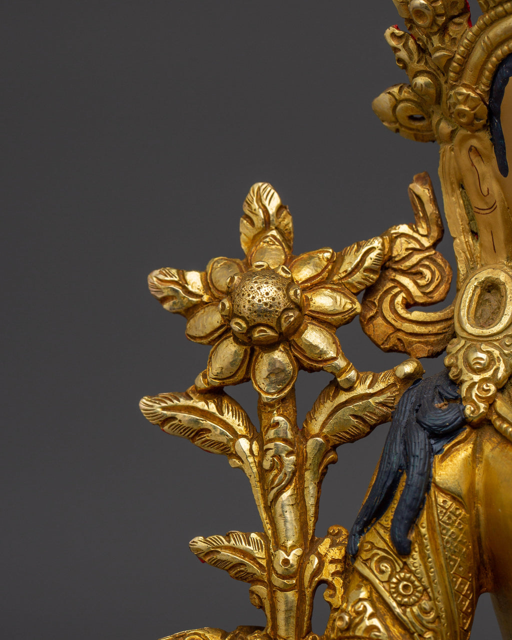 This Buddhist Deity Shyama Tara Decor Statue, also known as Green Tara, stands at 13”/33cm in height and 9.4”/24cm at the base, weighing 4.42 kg. Made from a copper body adorned with 24K gold gilding and detailed with gold and acrylic paintings, the statue radiates both elegance and spiritual depth. Expertly crafted by skilled Nepali artisans, this piece is ideal for altars, meditation rooms, or spiritual interiors, representing compassionate action and swift protection.