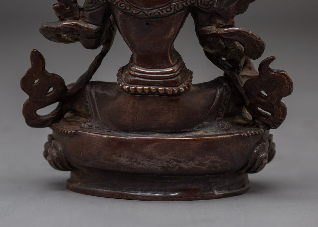 This Shyama Tara peaceful decor statue stands at 5.7”/14.5cm in height and 4.3”/11cm at the base, weighing 0.53 kg. Crafted from oxidized copper by skilled Nepalese artisans, this statue represents Green Tara, the compassionate protector who swiftly responds to the suffering of sentient beings. Ideal for meditation spaces, personal altars, or spiritual decor, it embodies serenity, protection, and the loving presence of the Divine Feminine.