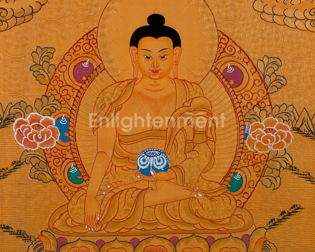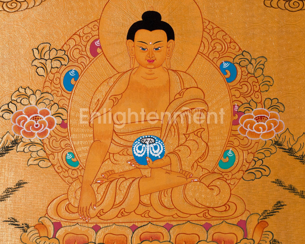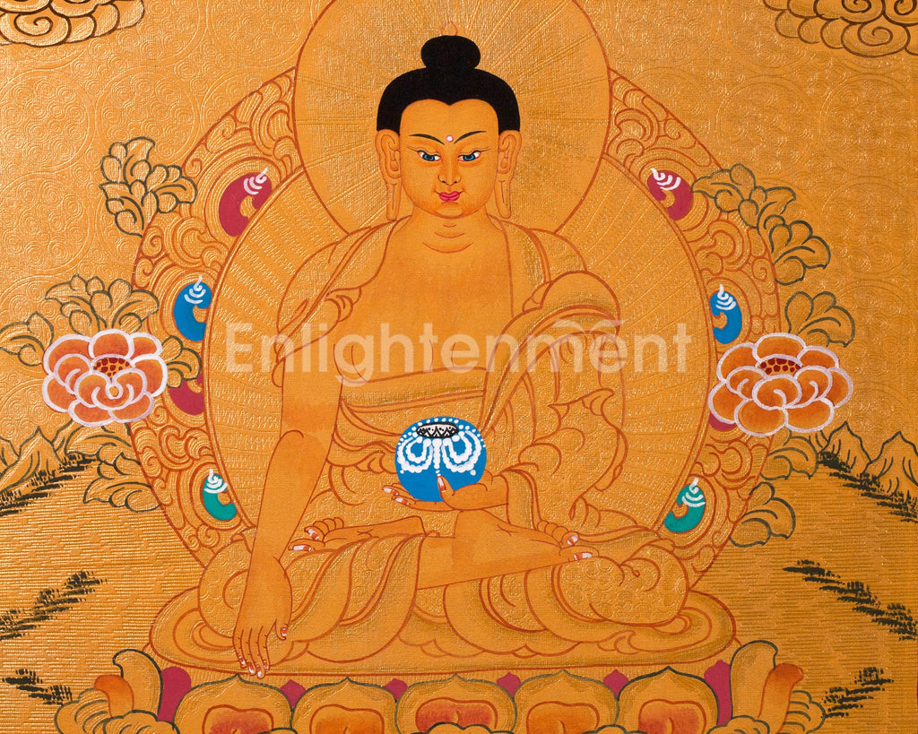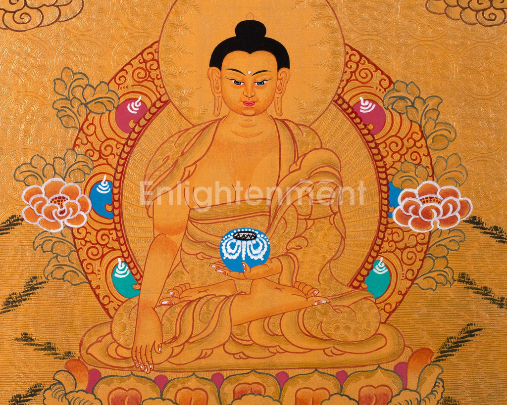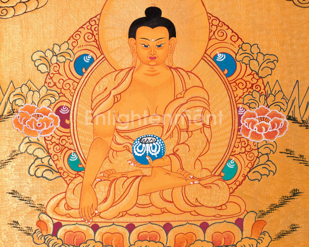 This thangka depicts Siddhartha Gautama seated on a lotus throne, radiating peace. His right hand, in Bhumisparsha Mudra, calls witnesses to his enlightenment, while his left hand holds an alms bowl, symbolizing detachment and compassion. A 24K gold halo emphasizes his enlightened state, with lotus petals and clouds evoking tranquility. The golden background signifies spiritual triumph, and every detail reflects care and reverence, making it both a spiritual icon and a work of art.
