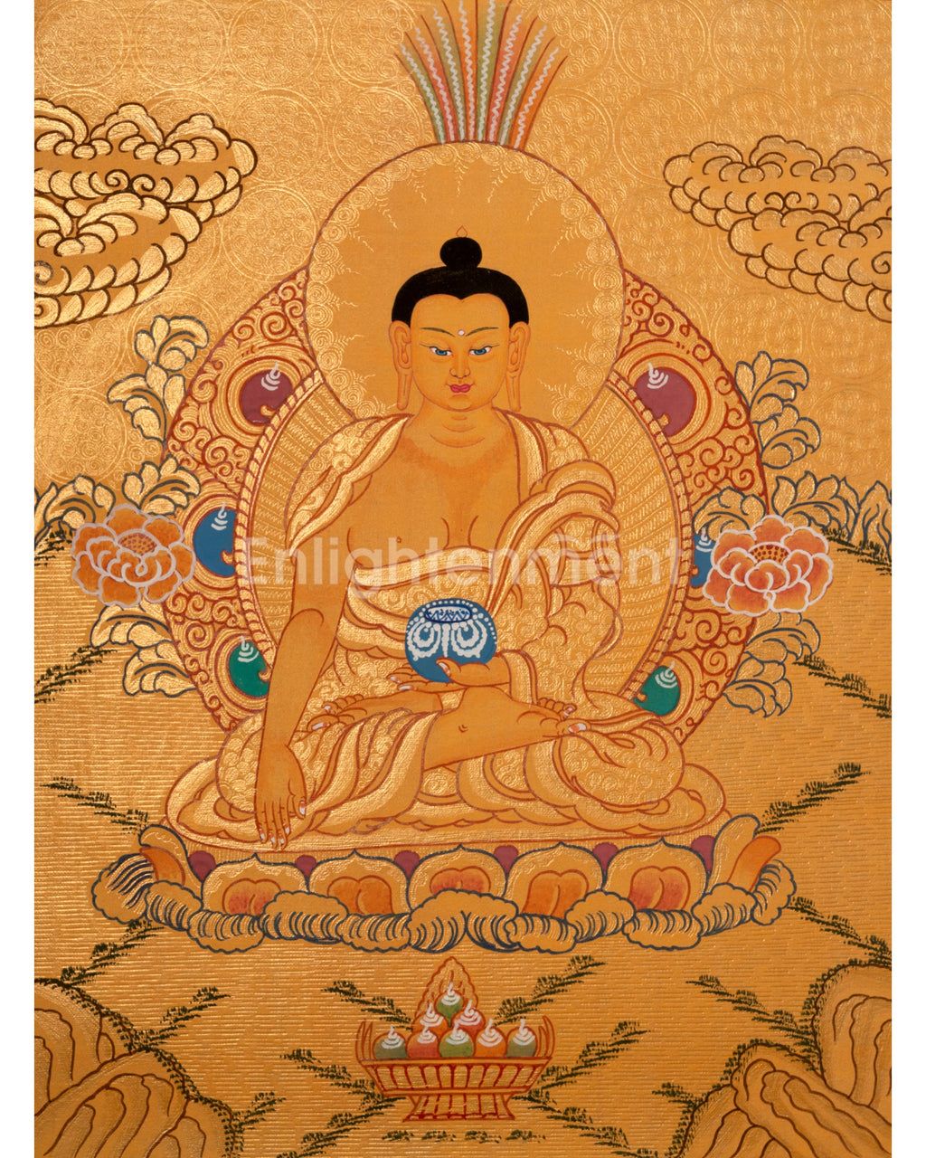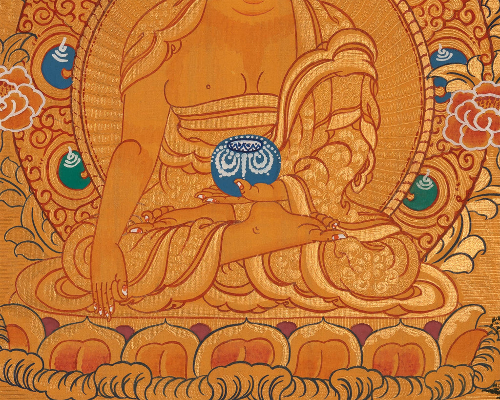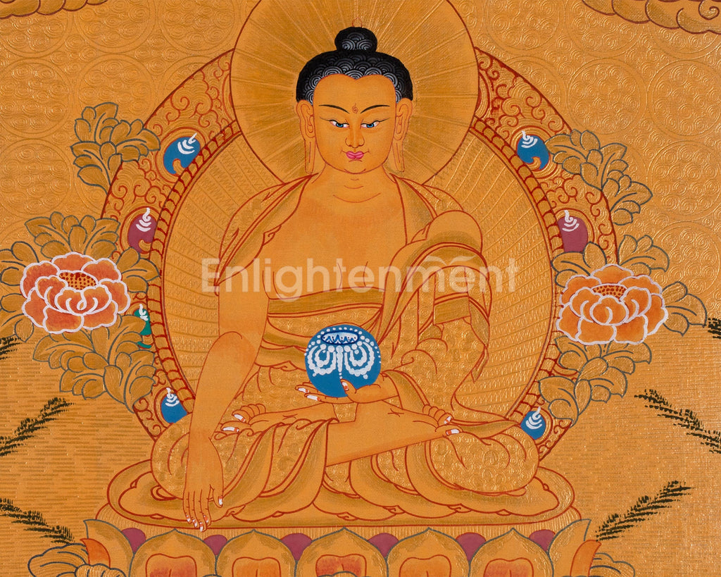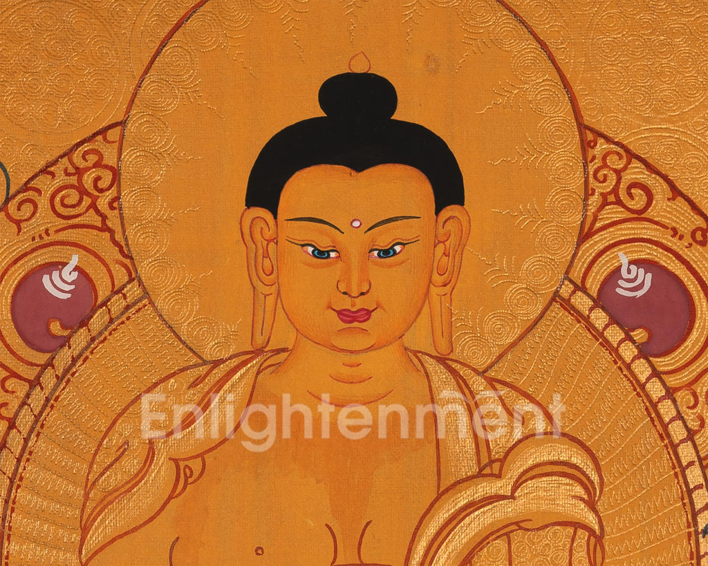 This thangka depicts Siddhartha Gautama seated on a lotus throne, radiating peace. His right hand, in Bhumisparsha Mudra, calls witnesses to his enlightenment, while his left hand holds an alms bowl, symbolizing detachment and compassion. A 24K gold halo emphasizes his enlightened state, with lotus petals and clouds evoking tranquility. The golden background signifies spiritual triumph, and every detail reflects care and reverence, making it both a spiritual icon and a work of art.