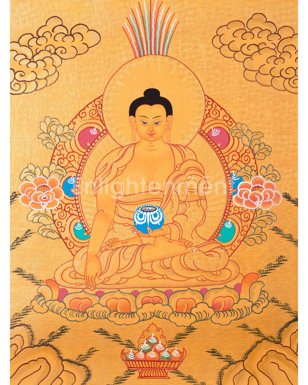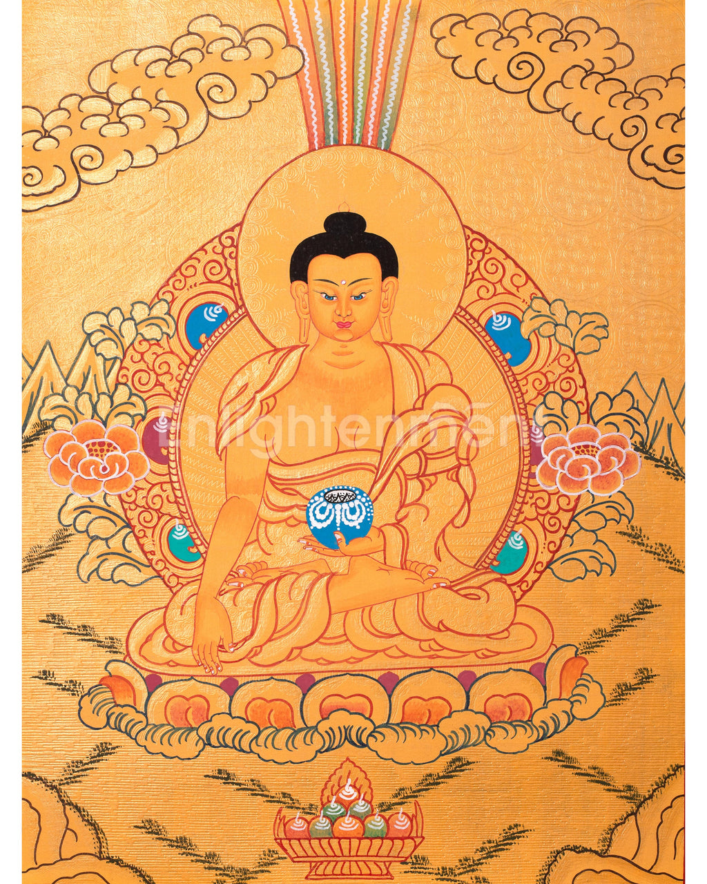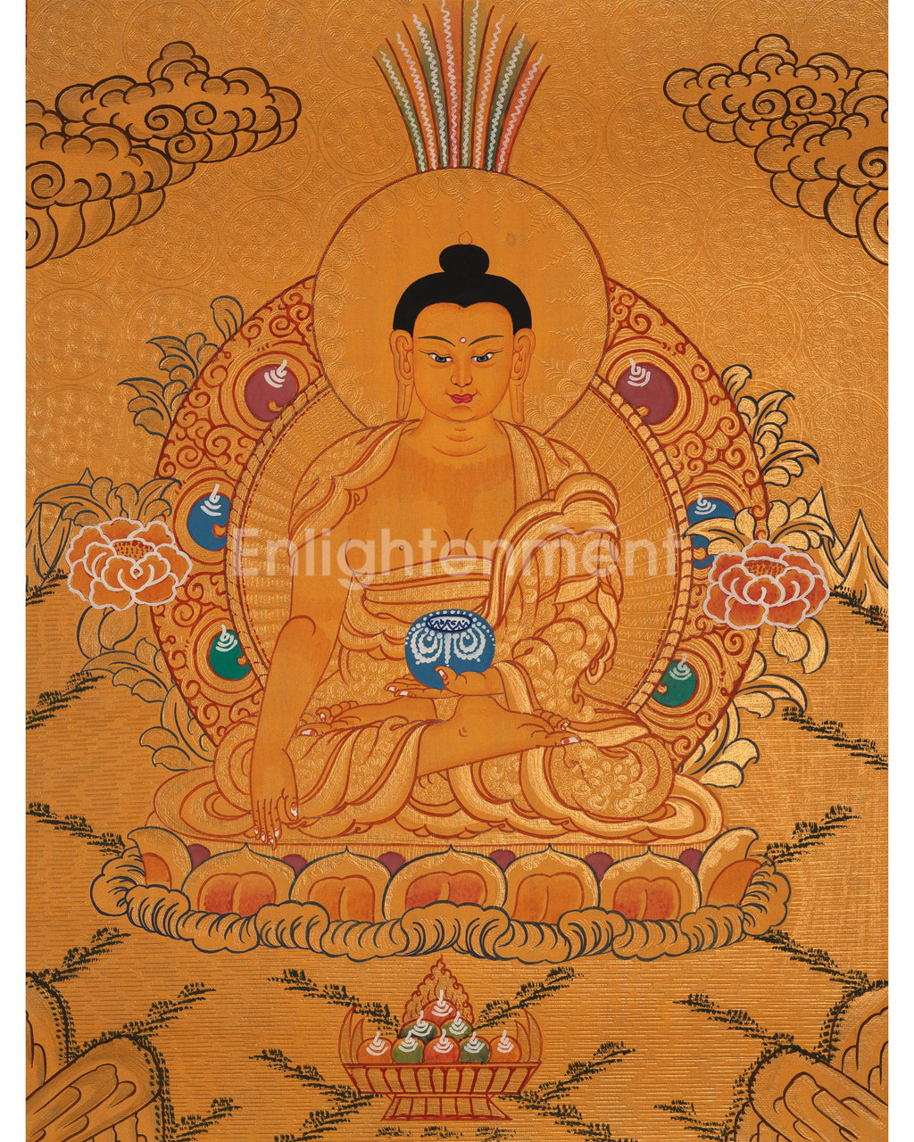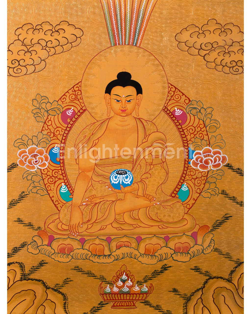 This thangka depicts Siddhartha Gautama seated on a lotus throne, radiating peace. His right hand, in Bhumisparsha Mudra, calls witnesses to his enlightenment, while his left hand holds an alms bowl, symbolizing detachment and compassion. A 24K gold halo emphasizes his enlightened state, with lotus petals and clouds evoking tranquility. The golden background signifies spiritual triumph, and every detail reflects care and reverence, making it both a spiritual icon and a work of art.