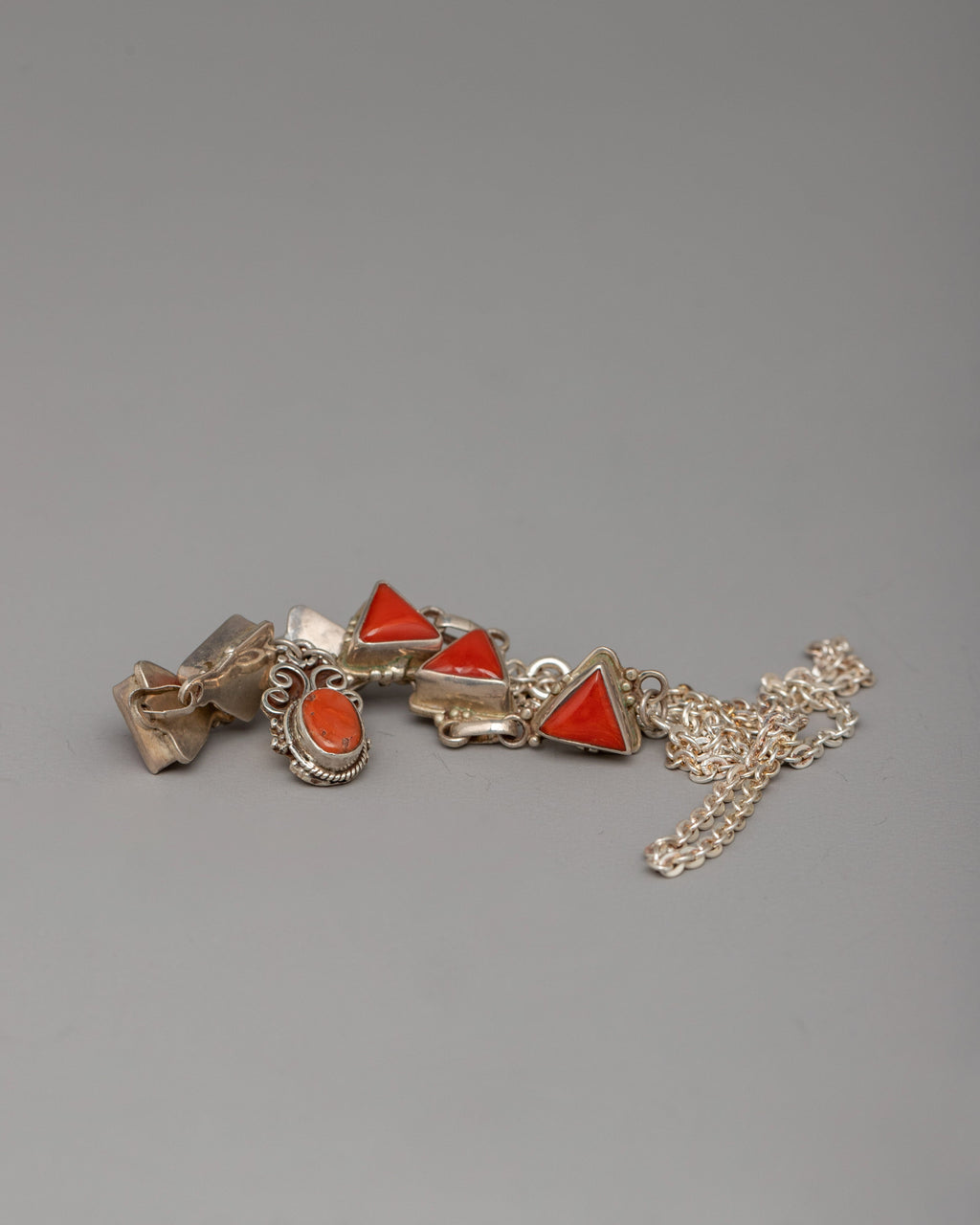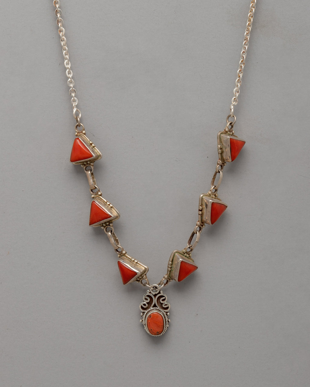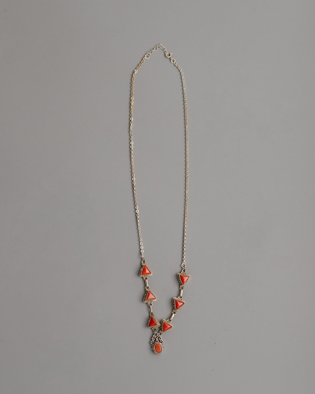 Coral, which has been linked with vitality and energy, makes this necklace a meaningful addition to any jewelry collection in addition to being an energetic fashion statement. The delicate silver detailing provides a touch of sophistication, while the coral stones' special triangle arrangement adds to its bohemian attraction.
