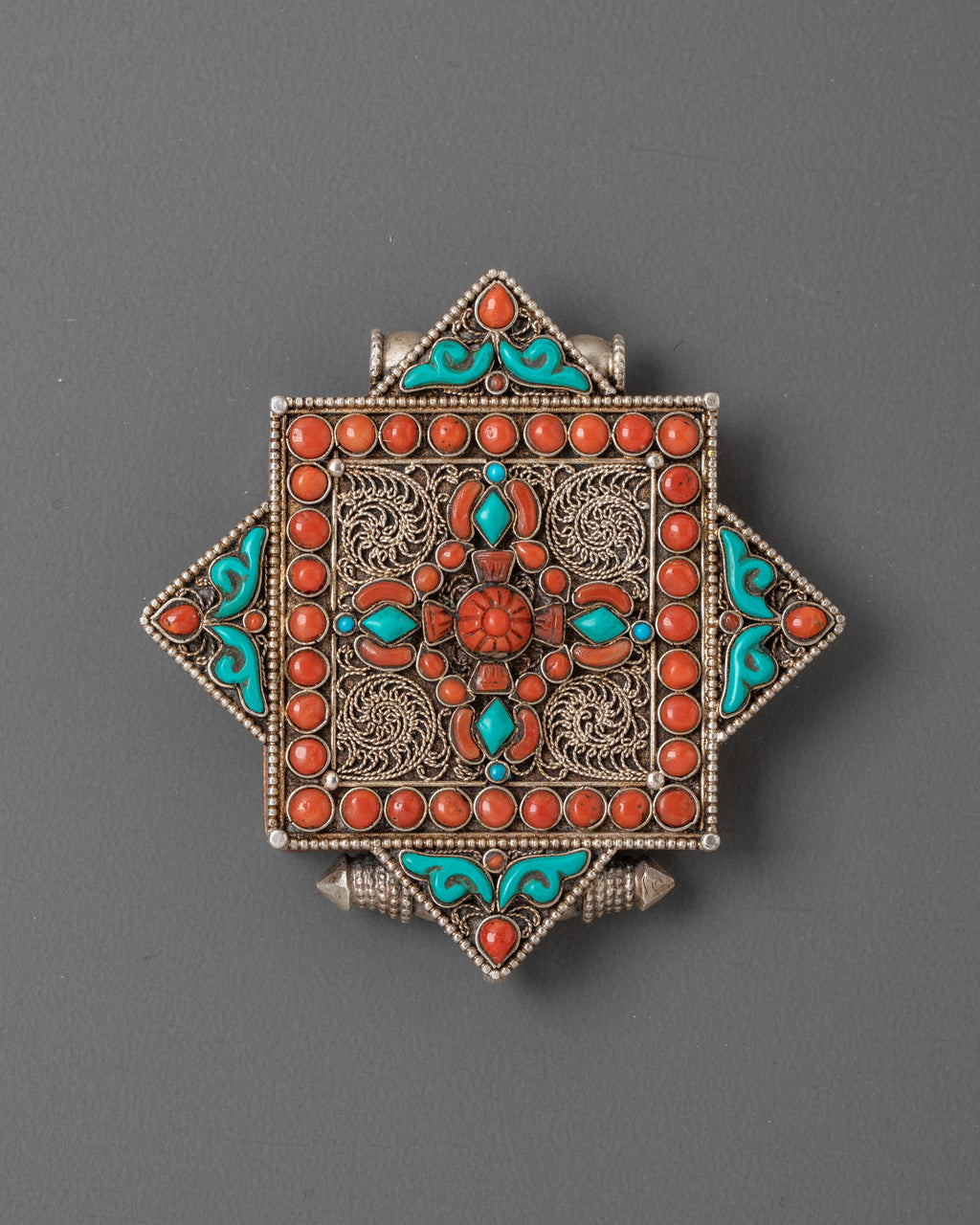 The Silver Bishwo Vajra Ghau Box Locket is a beautifully crafted spiritual accessory that blends elegance with deep symbolism. Made of silver, the locket features intricate Bishwo Vajra motifs that represent the universal force of enlightenment and spiritual power. The design is further enhanced with semi-precious stones, including turquoise and coral, which are believed to promote healing, protection, and emotional balance.