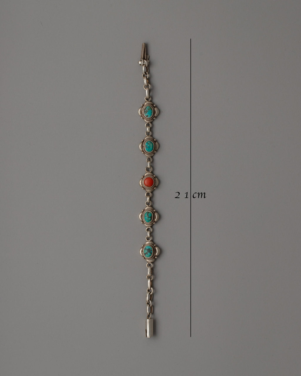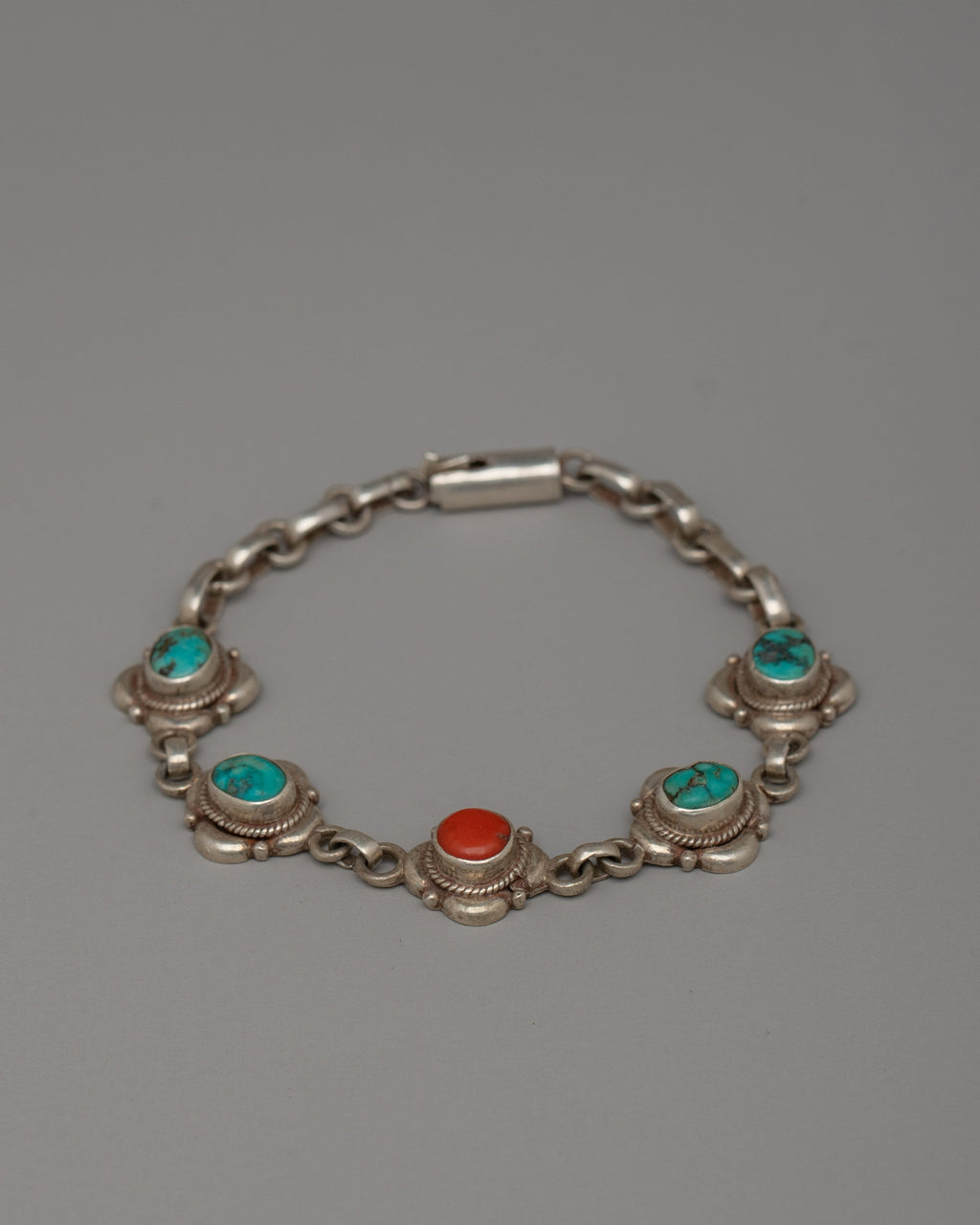 A masterpiece of craftsmanship, this traditional handmade jewelry comprises 92.5% silver and 7.5% copper for strength and style. Vibrant inlays of coral stone and turquoise embellish the pattern, lending it a touch of both cultural importance and natural beauty. Because each item is expertly made, it is a classic piece of jewelry for anybody who values traditional artistry.