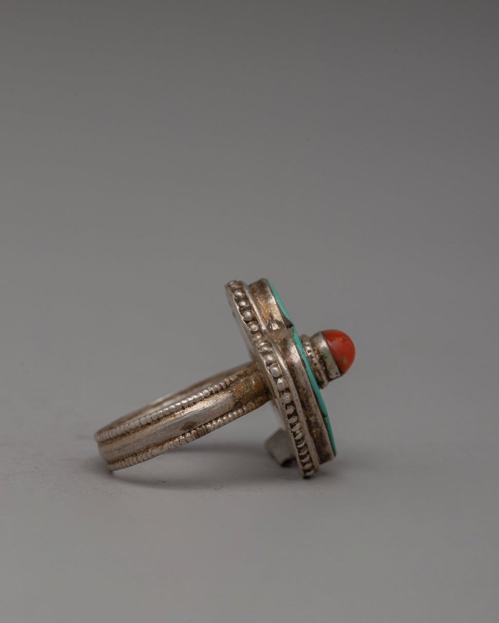 This gorgeous handcrafted silver coral and turquoise ring will add a touch of striking elegance to your collection. This individual handmade design, which is made of 92.5 sterling silver with copper styles, is a striking and attractive statement piece that includes original coral and turquoise stones. This ring is beautiful and easy to wear, measuring 2.3 cm in height, 3 cm in width, and 11 cm in diameter. It weighs 0.004 kg.