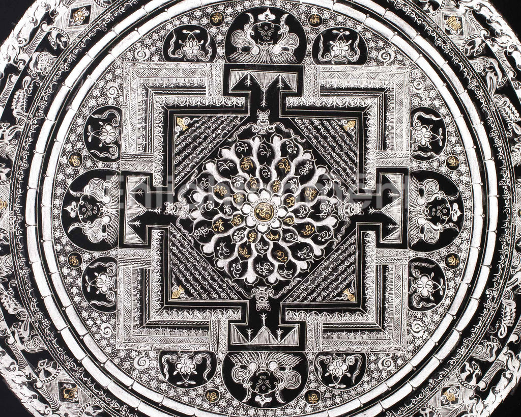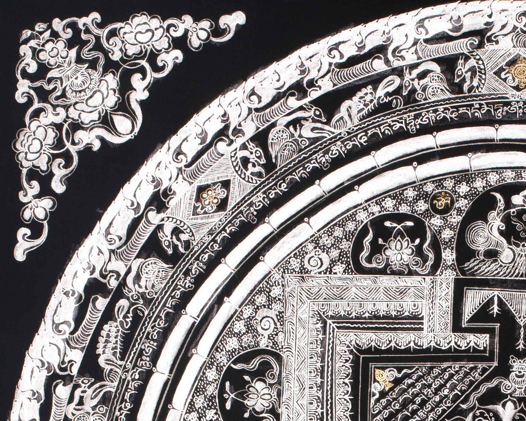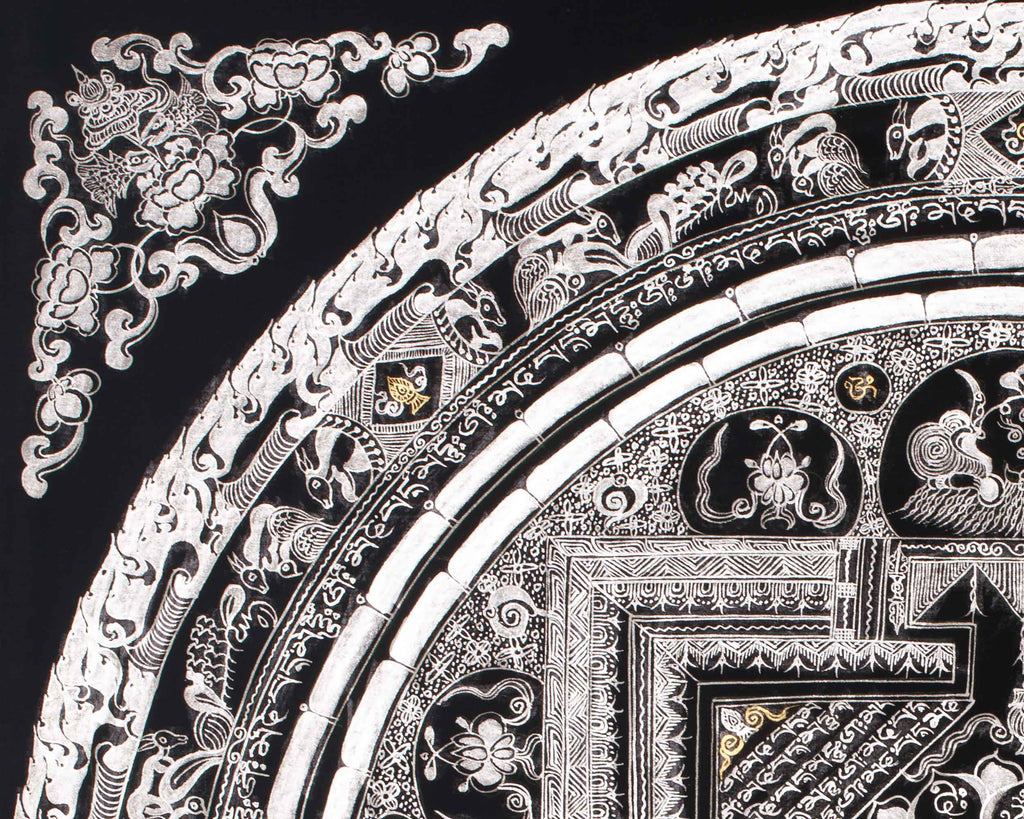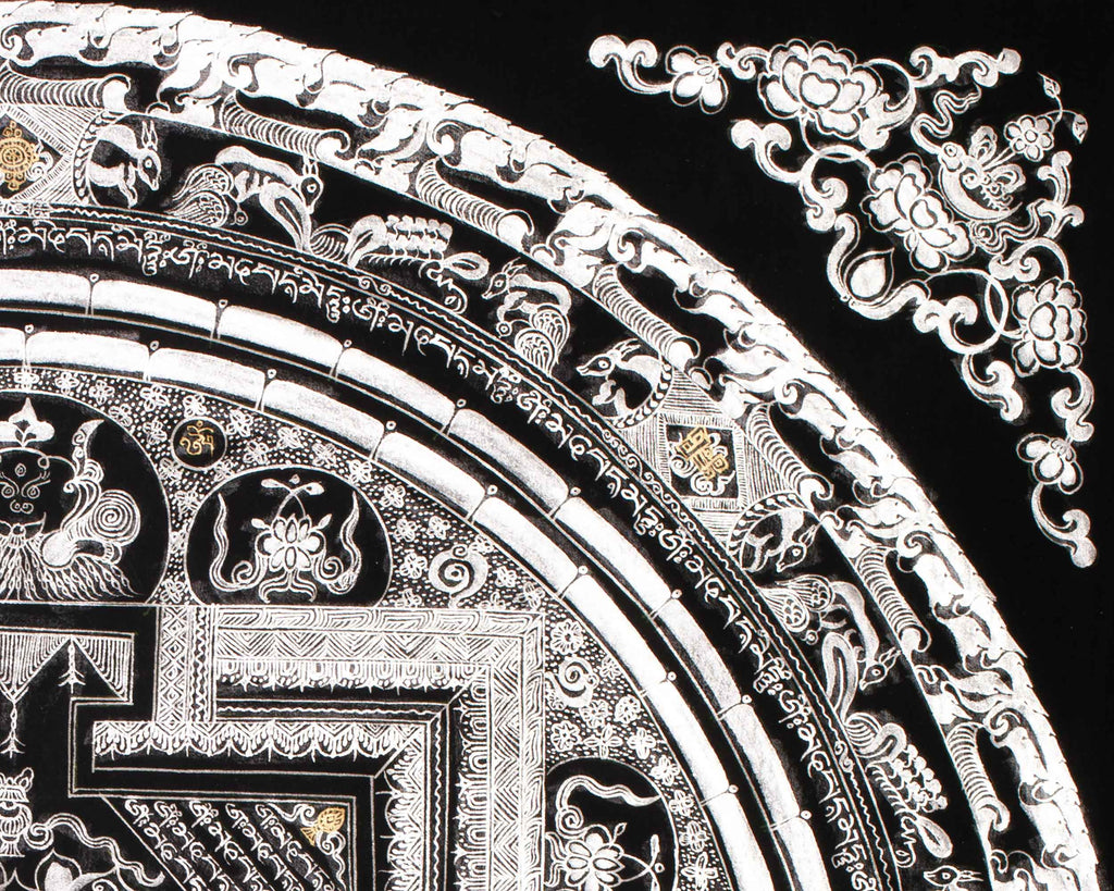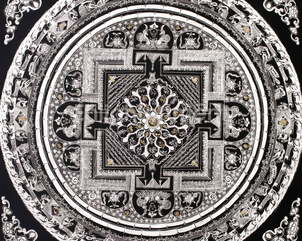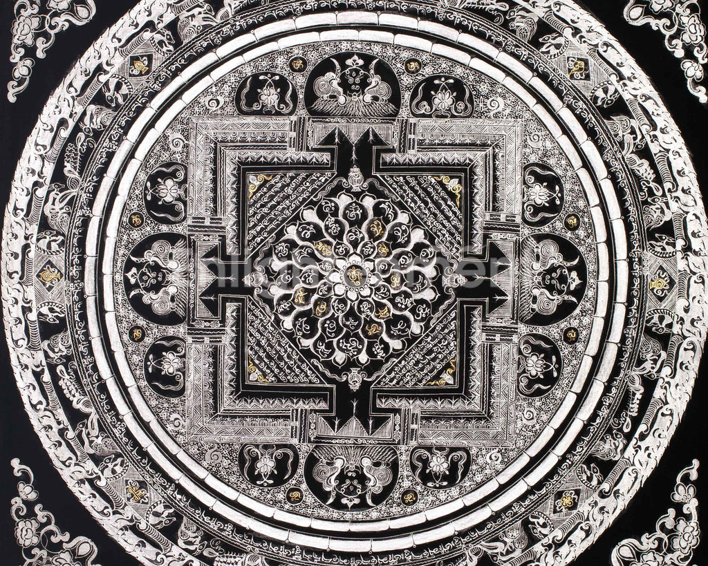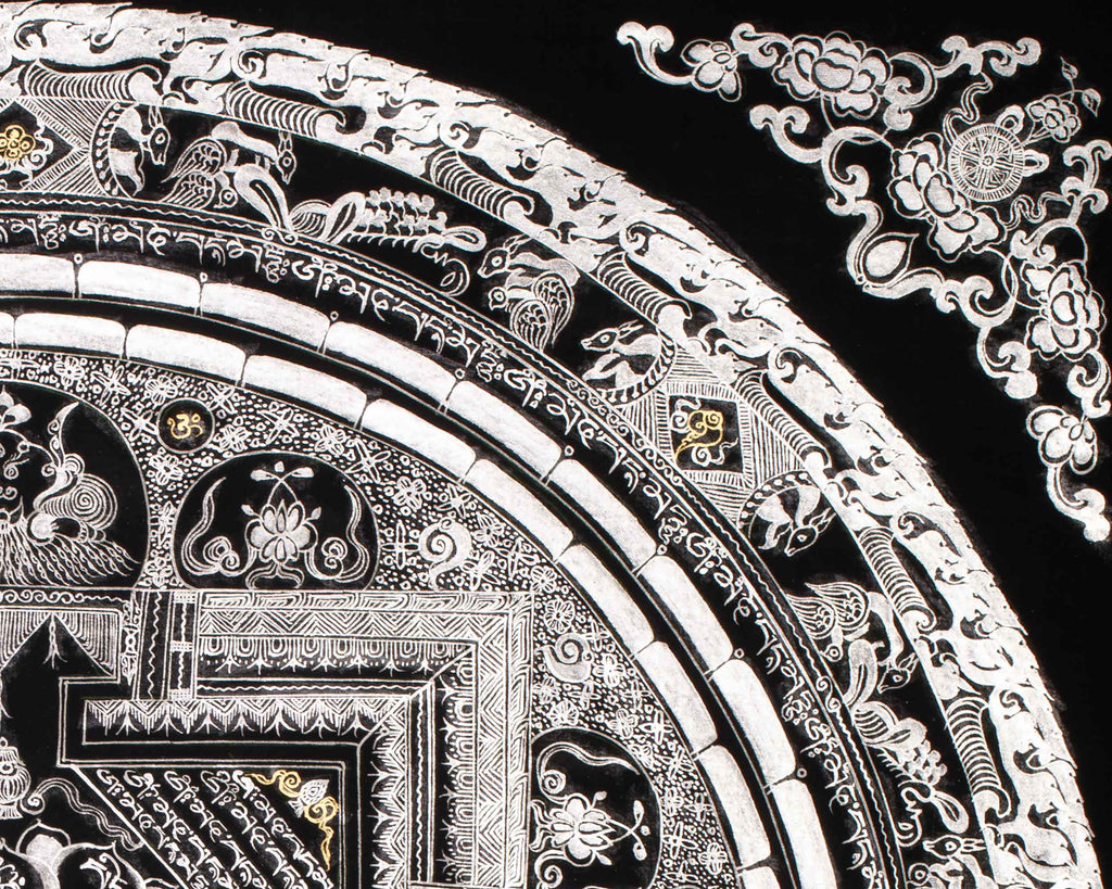 At the heart of the mandala sits a powerful spiritual symbol, surrounded by carefully inscribed mantras, including "Om Mani Padme Hum." These mantras, recognized for their profound spiritual importance, radiate compassion, wisdom, and enlightenment. The pure silver accents enhance the energy of the mantras, adding a sense of purity and divine light to the piece. This thangka is more than just decorative art; it functions as a potent tool for meditation and reflection, bringing peace, mindfulness, and spiritual connection to any space.