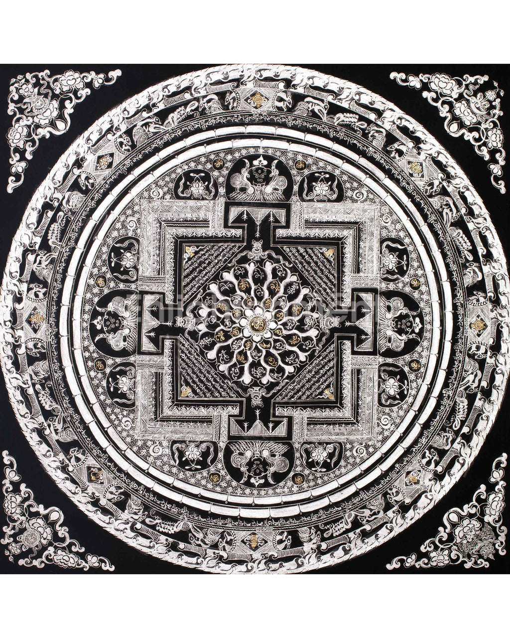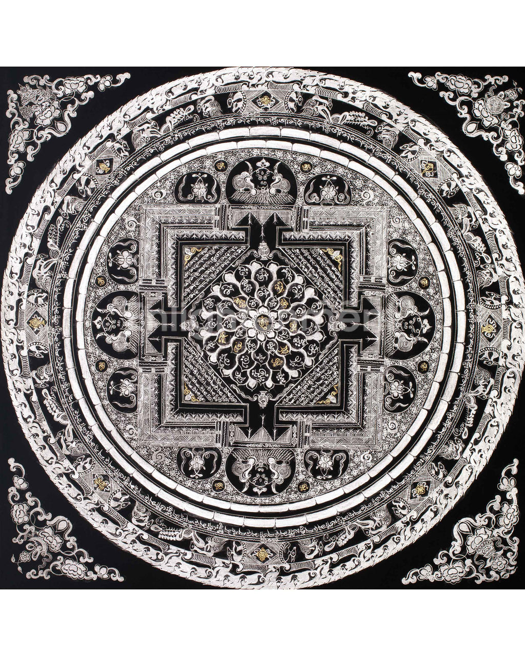 The Silver Mantra Mandala Painting is a stunning, hand-painted thangka, meticulously created on high-quality cotton canvas using pure silver and vibrant acrylic colors. Made in the traditional Tibetan style by a skilled Nepali artist, this piece reflects both the timeless techniques and the spiritual depth of Tibetan Buddhist art. The intricate silver details give the mandala a luminous quality, while the rich acrylic colors emphasize its sacred geometry, creating a harmonious balance of artistry and devotion.