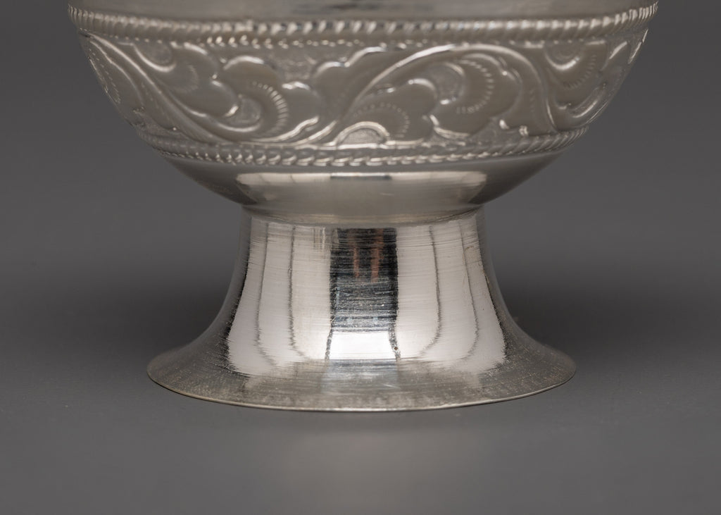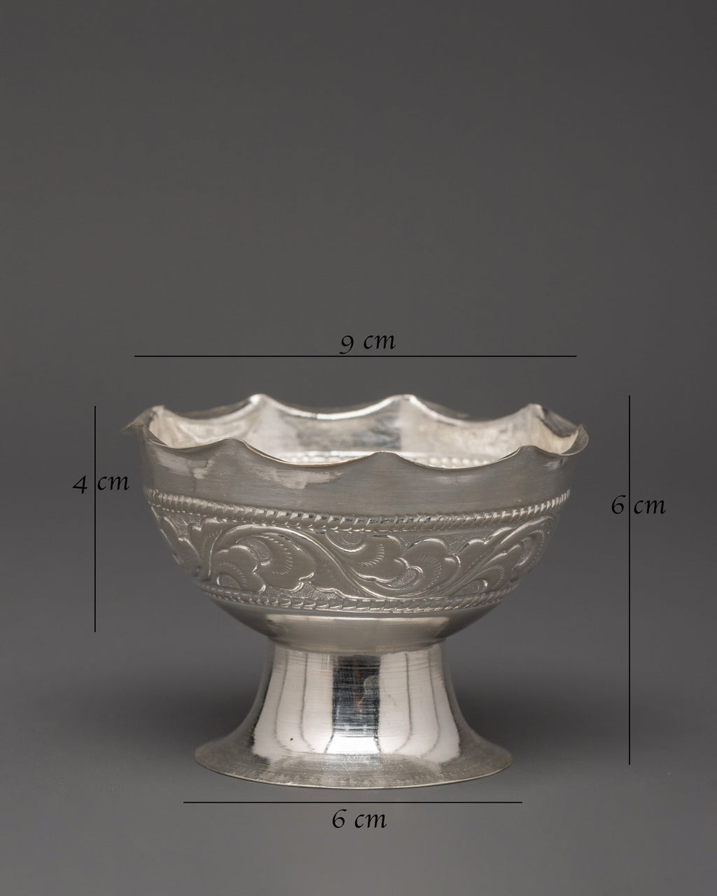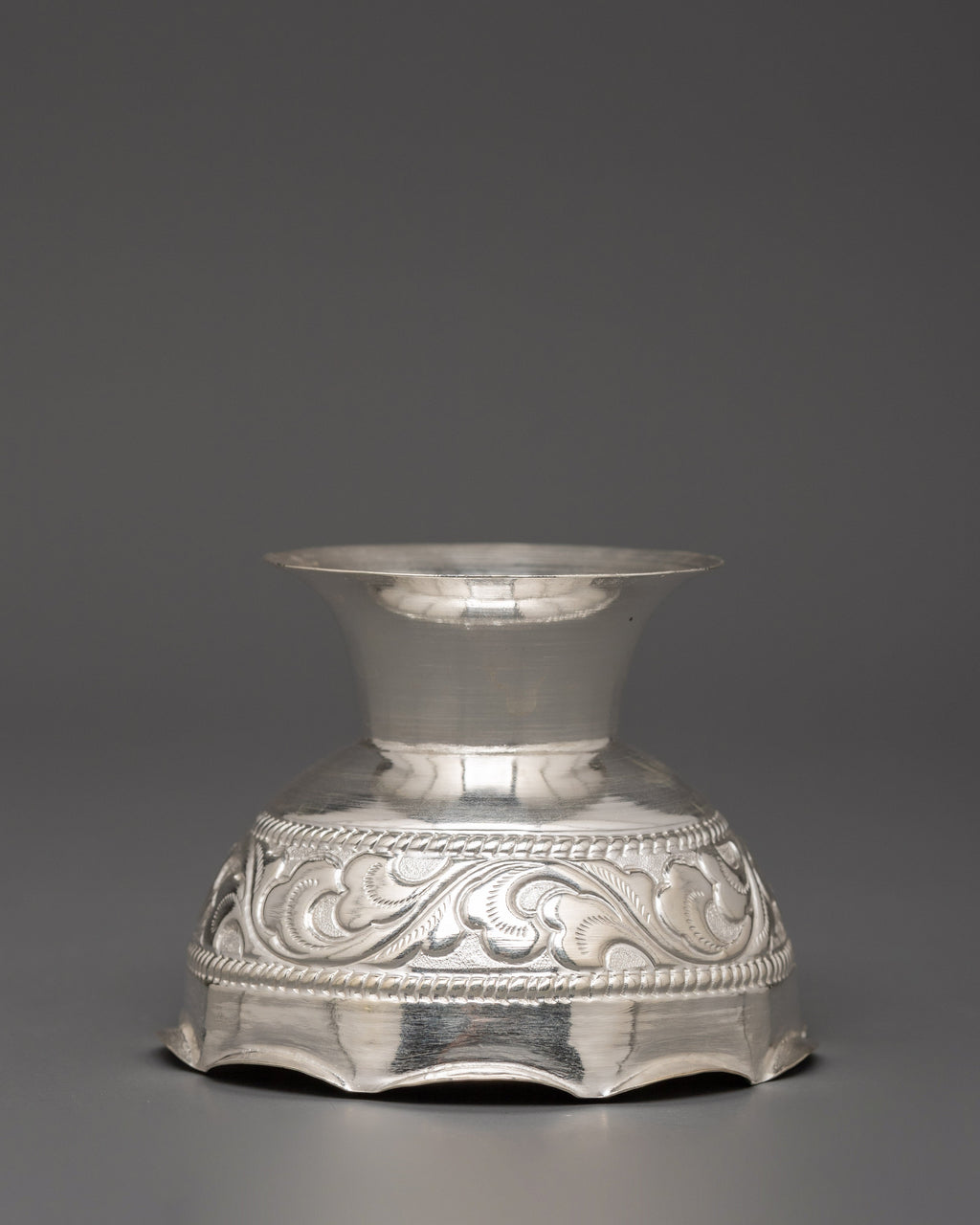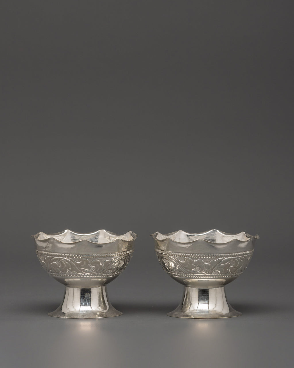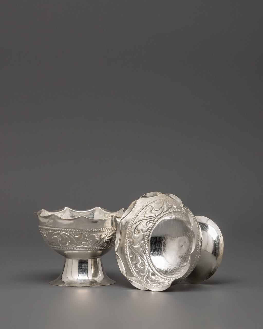 Offering bowls have great value in Buddhist and Hindu cultures. These bowls, commonly used for carrying water, grains, flowers, or other symbolic components, indicate dedication and regard. Their bright silver brilliance elevates the sanctity of your shrine or meditation place, while the traditional floral engravings convey cultural richness and sacred beauty.