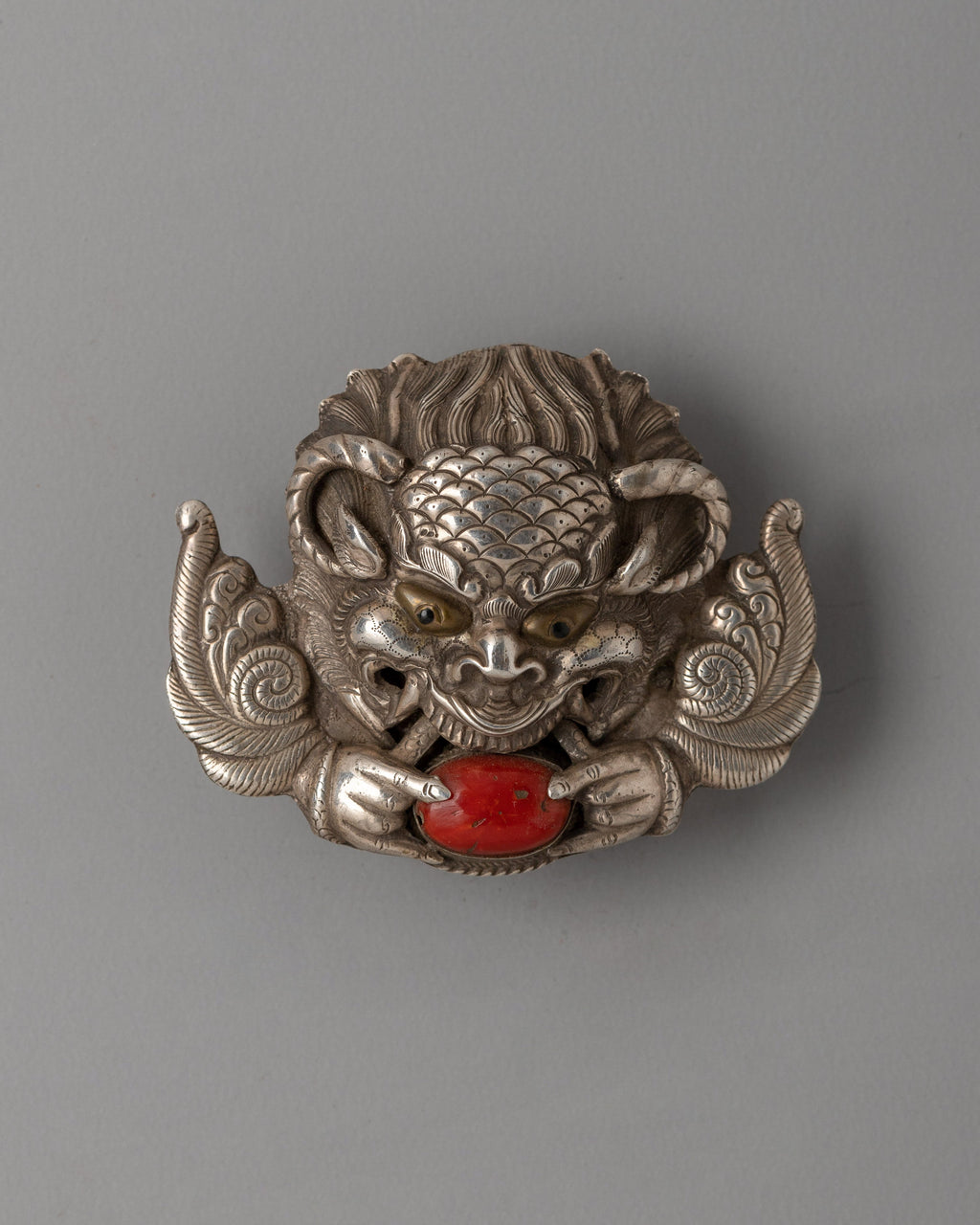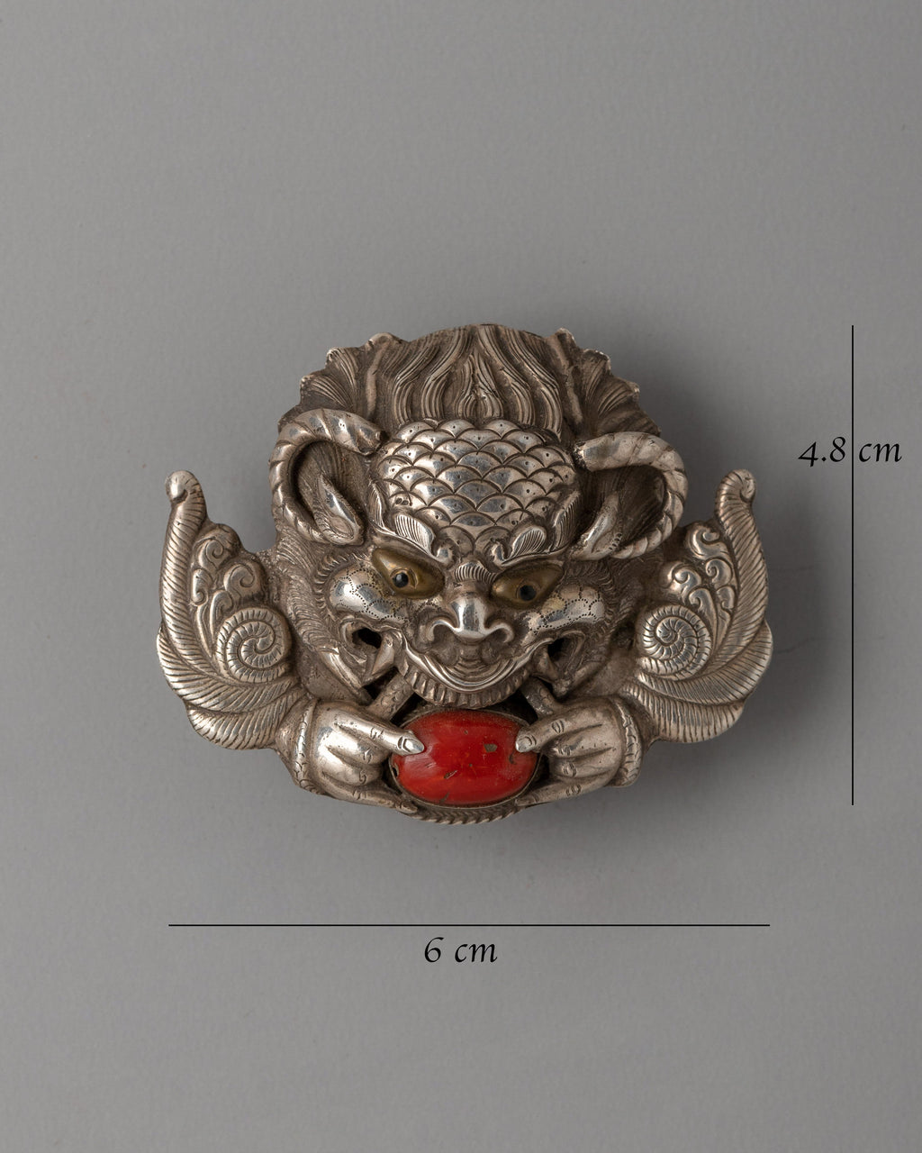 Traditionally inspired by Tibetan themes, the buckle design symbolizes protection and spiritual strength, making it meaningful and beautiful. The silver plating creates a refined appearance, while the coral inlay gives an element of color. Whether utilized as a helpful accessory or as a collector's item, this buckle is a beautiful work of art that is individual.