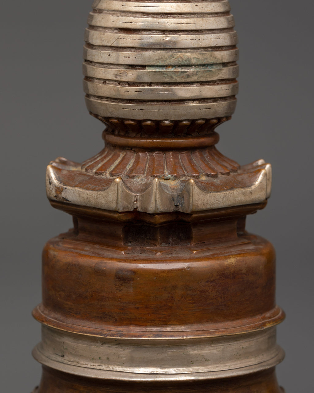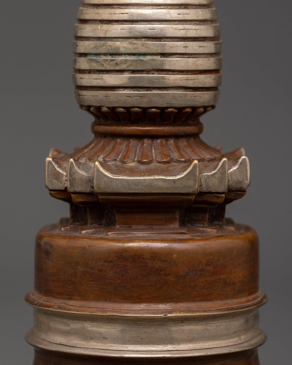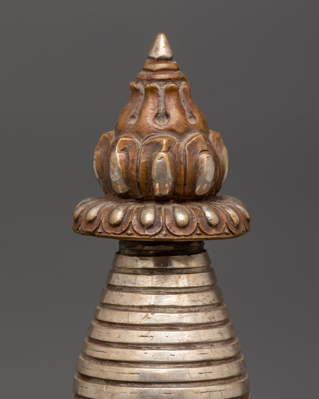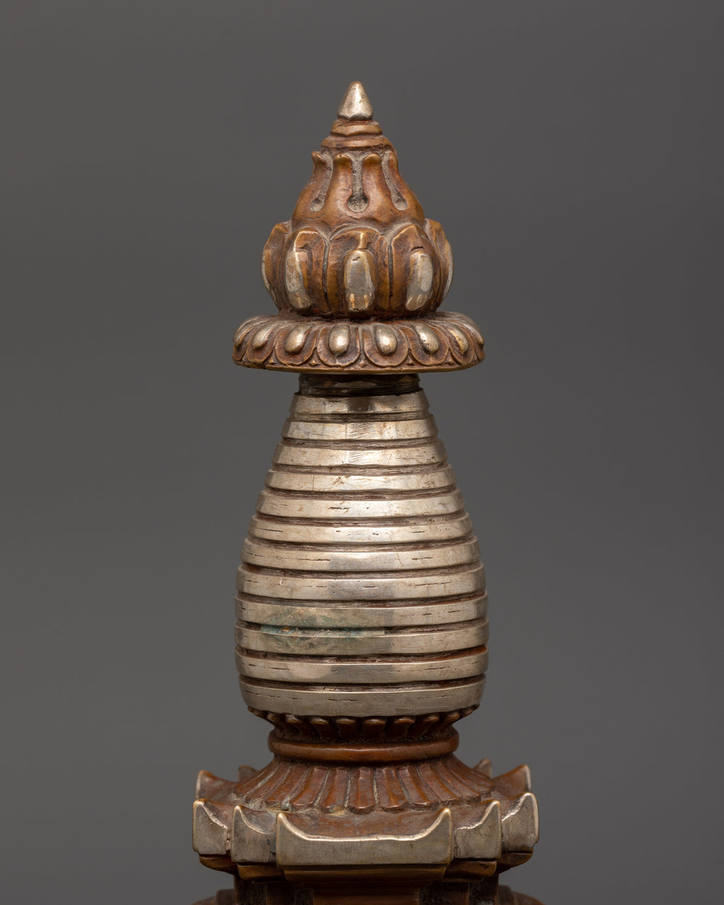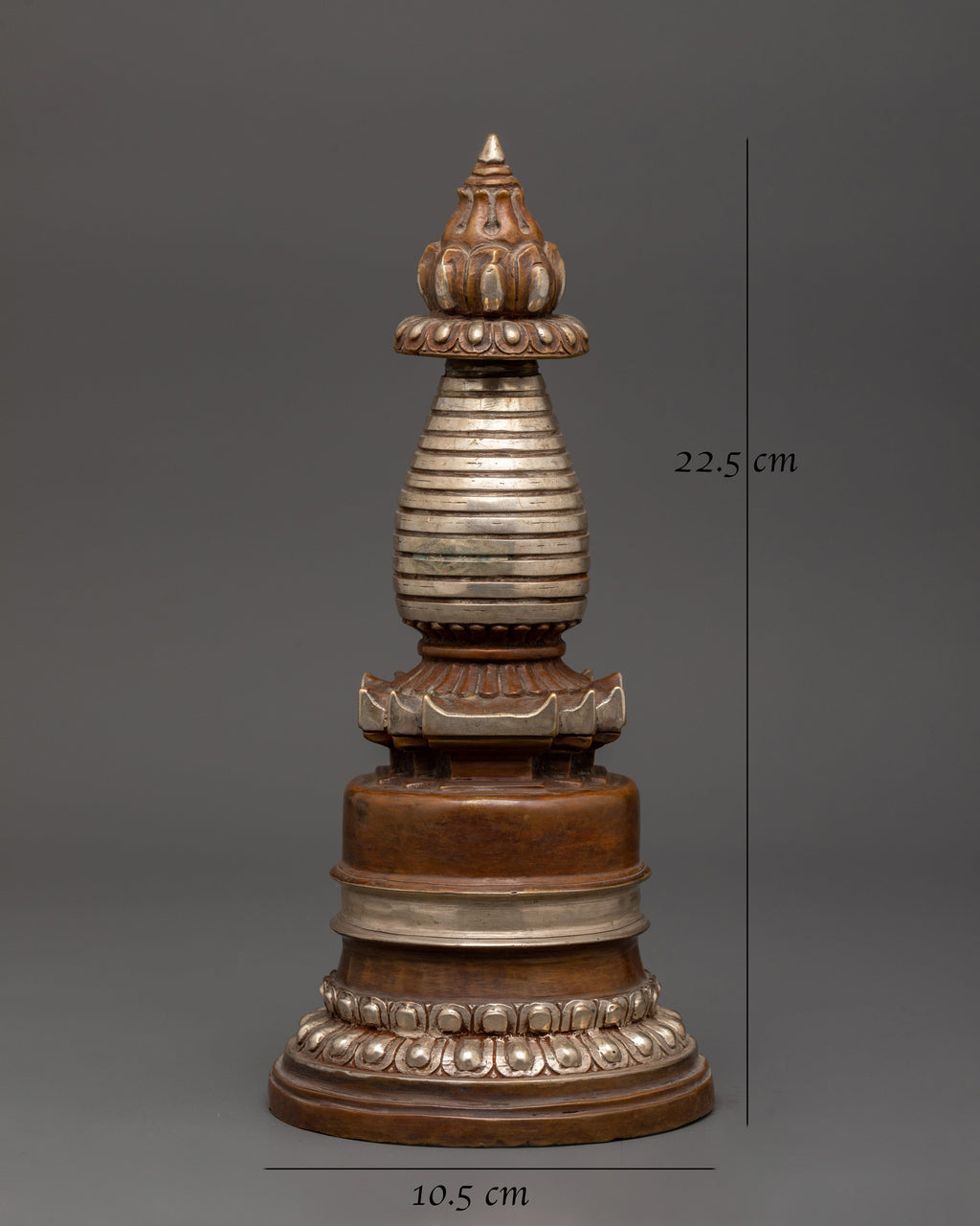 This handmade stupa is 22.5cm tall and 10.5cm wide and weighs 1.00kg. It is crafted from oxidized copper and delicately silver-plated and reflects the enduring spirit of ancient Buddhist art. The base, lotus patterning, and flame-shaped pinnacle represent the phases of spiritual enlightenment and the Buddha's enlightened mind.