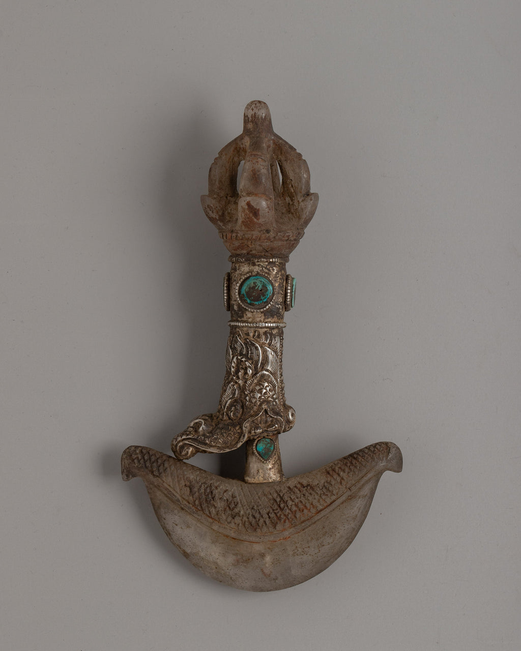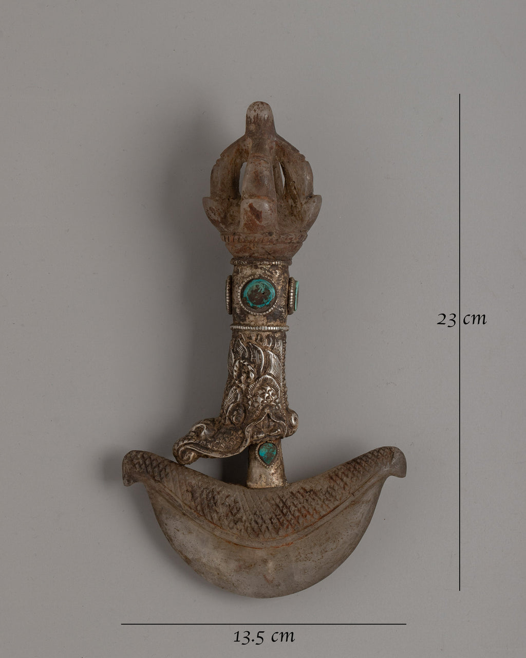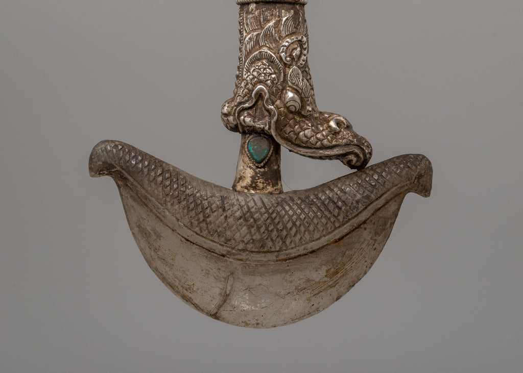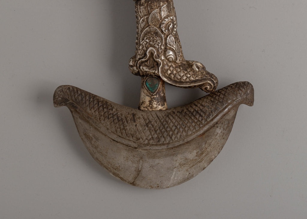 Featuring a crystal and silver plating, this 23cm Handmade Silver-Plated Crystal Kartika Knife is a sacred Buddhist ceremonial implement. The knife's eye-catching inlay of turquoise stone represents clarity and wisdom. Traditionally used in Buddhist ceremonies, the Kartika knife symbolizes the severing of ties and ignorance that leads to enlightenment and spiritual freedom.