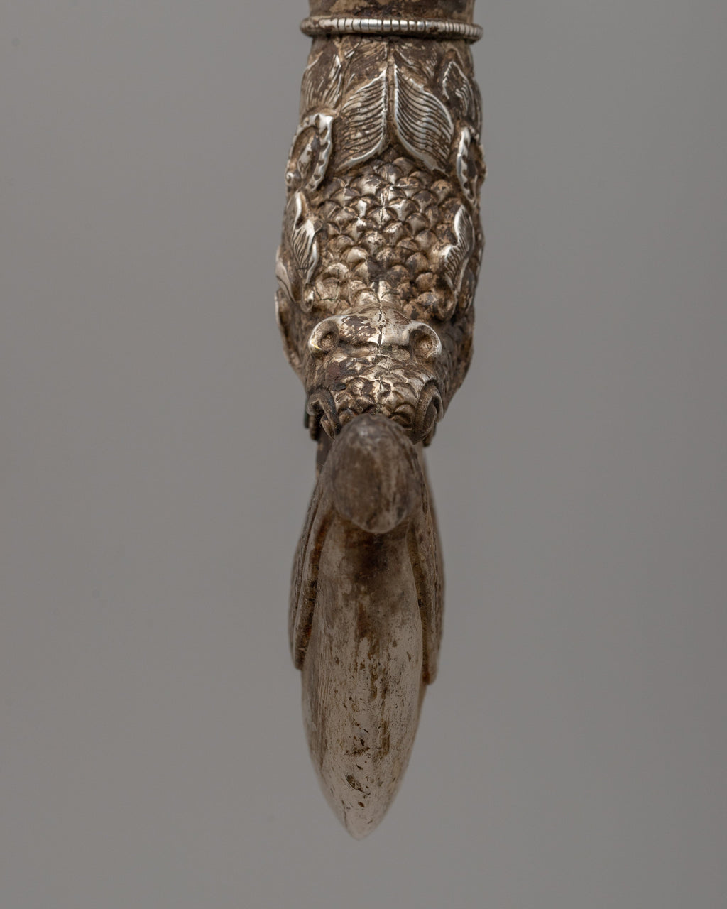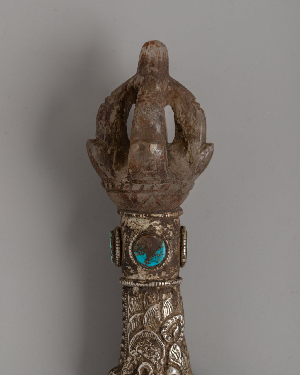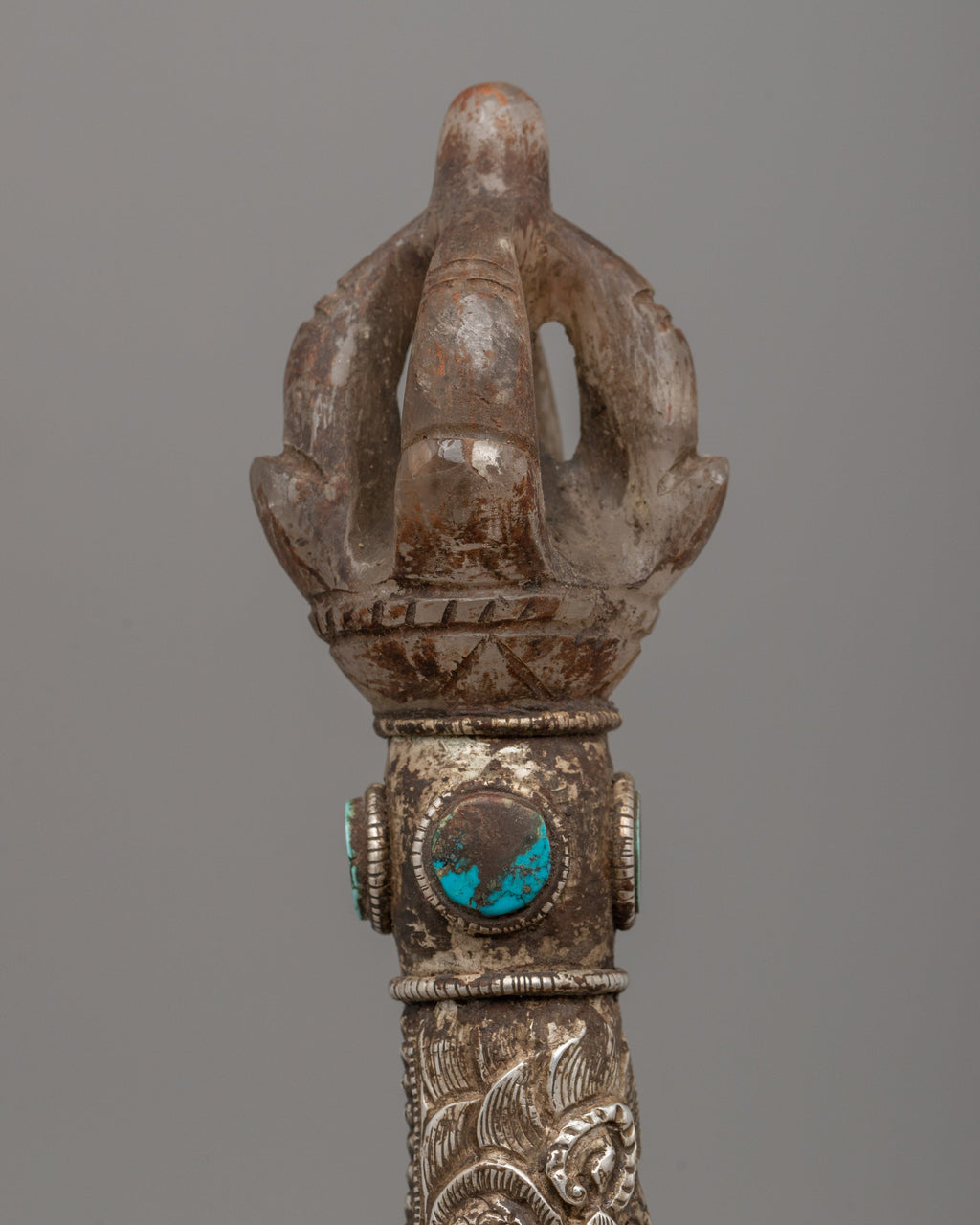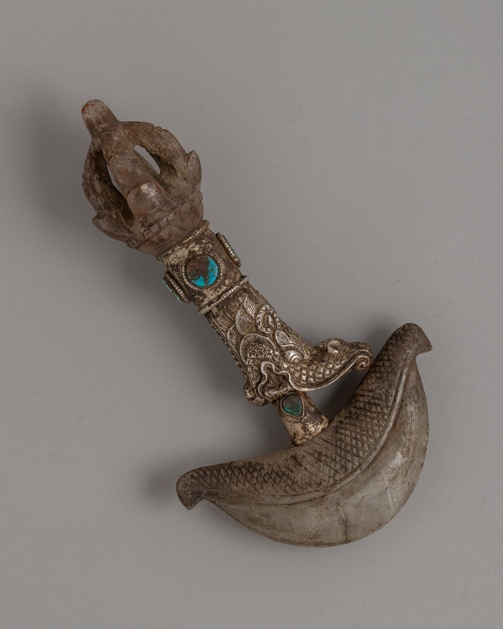 Featuring a crystal and silver plating, this 23cm Handmade Silver-Plated Crystal Kartika Knife is a sacred Buddhist ceremonial implement. The knife's eye-catching inlay of turquoise stone represents clarity and wisdom. Traditionally used in Buddhist ceremonies, the Kartika knife symbolizes the severing of ties and ignorance that leads to enlightenment and spiritual freedom.